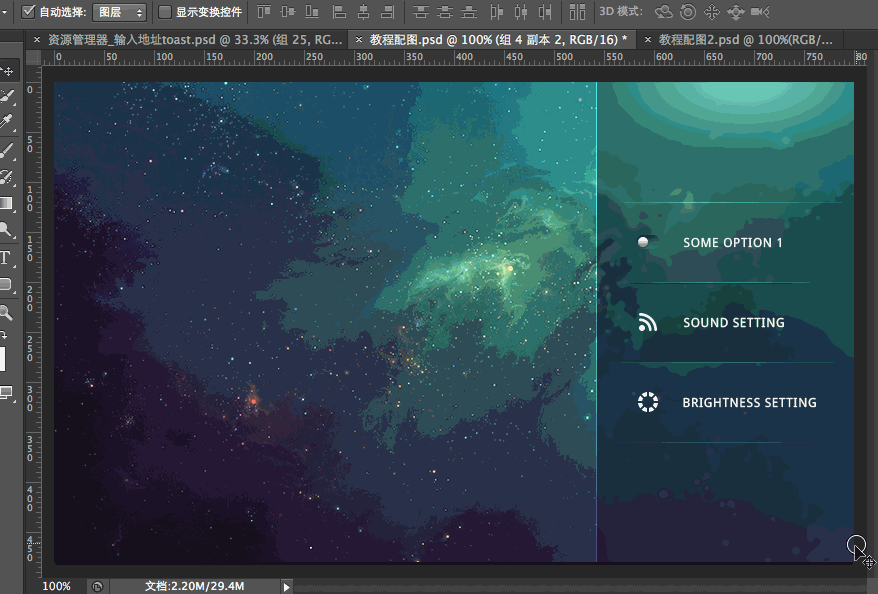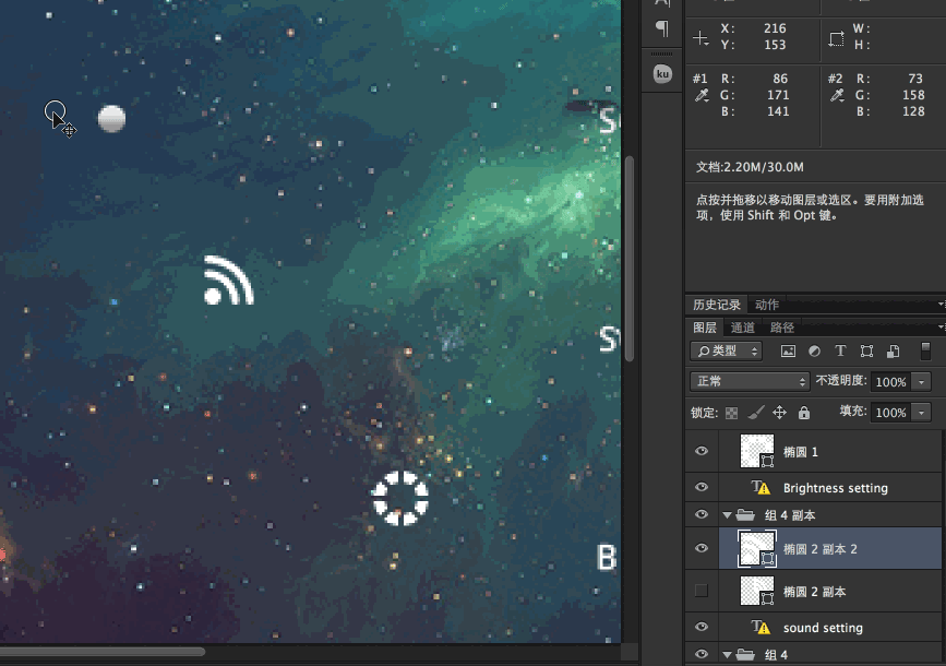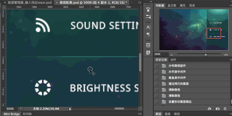 这里有一个小秘诀:在把物件拖到另一个文件中时,按住Shift,如果两个文件尺寸是一样大的,那么它就会粘在原来的位置;如果尺寸不同则会粘在画板正中央。此方法无论是图层、路径、形状、选区…只要是能拖动的东西都可以实现。