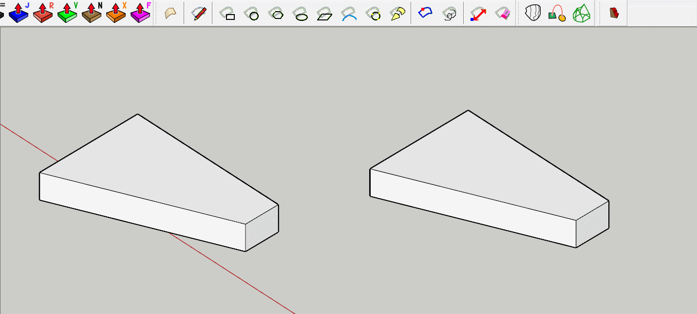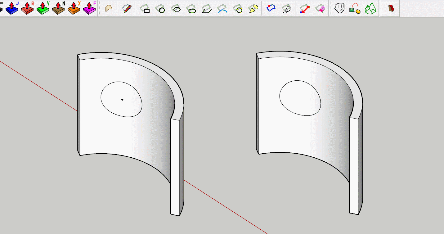 图中左侧使用su自带推拉工具。可以看到推拉出来的部分并没有按照原有图形的走势。而右侧使用插件中推拉工具则可以使推拉出来的部分按照原来模型的走势继续推拉。