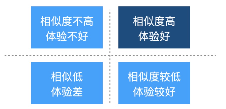 通过刚才的联想或者说头脑风暴、已经查出了很多的关键词或者一些产品的名字。接下来要把这些竞品大概的浏览一遍、有一个初步的体会。如果体验特别差的产品可以剔除。然后我们通过“相似度”“体验好”的四象限原则确定重点分析的和选择性分析的产品,如图所示: