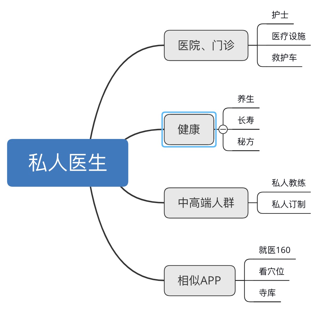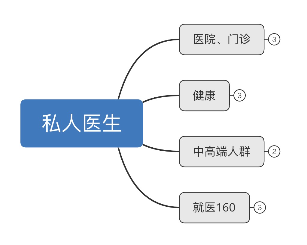 比如说我们准备做一款私人医生的APP、现在如何选择竞品呢。我们可以把产品的定位拆分成几个方向、并用关键词表达出来,当然这个过程你可以和相关业务人员一起完成。如图所示:
