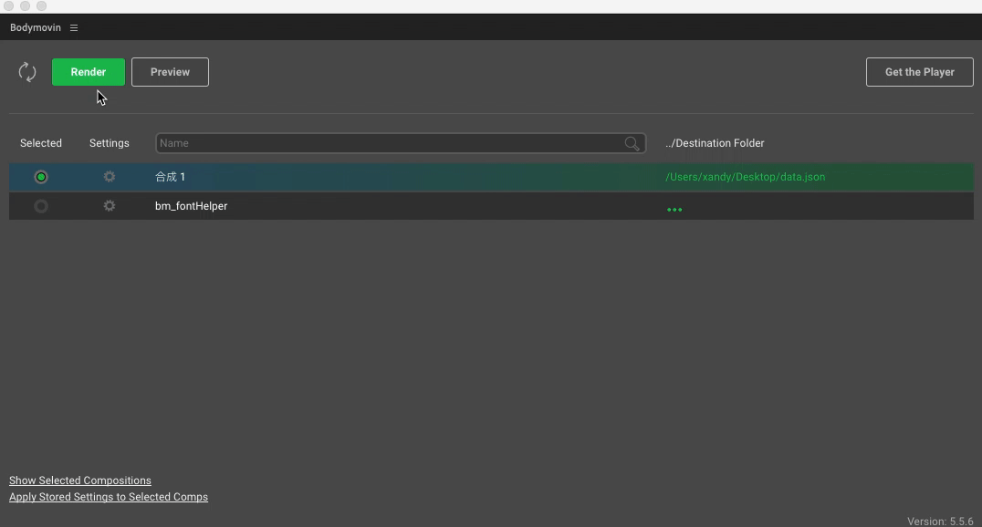 第五步,先选择你要导出动画的存储路径,然后点击渲染即可将你选择的合成动画导出为Json文件。输出Json后,可以点击左上角的预览(preview)按钮,拖动下面的滑块进行预览。