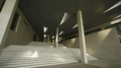 这个“大开口”的走廊空间,三十级宽长的台阶对面,就是那一湾湖面。标识性的锐角三角形天顶,是艺术中心自然采光的来源。随着太阳的移动,投射下来的奔走的光影。