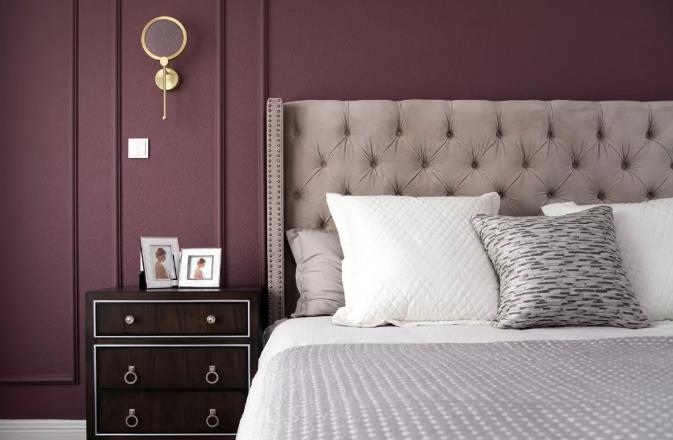 主卧,特地根据业主的偏好选定的墙面色彩,搭配卡其色高背床,与白色、金色元素营造高级浪漫的格调