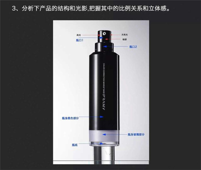 先来分析这张图,高光太柔、太曝,暗部死黑没有细节,瓶身的各个结构太不明显,细节太少,次高光太线,没有立体感,瓶底部分太脏太乱。