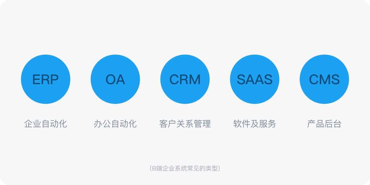 还有一种面向对企业内部管理,员工使用的B端产品,例如ERP、OA、CRM、SAAS、CMS等,这些都是在企业内部业务类型的产品,所以我简单解释一下这几种产品。