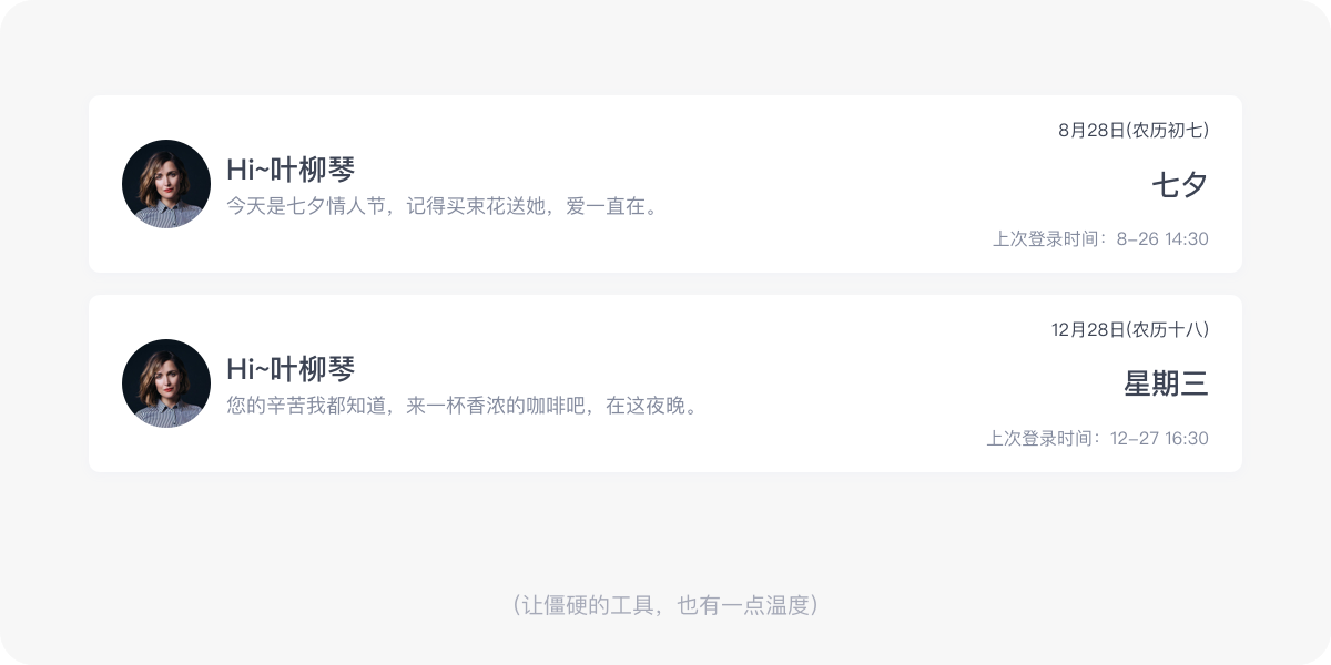 B端后台产品使用的场景和目的相对C端产品有着很多的差别,前者是为了工作而使用这个产品,因此他们必然要长时间使用产品,而且是沉浸式使用,他们不能带着个人喜好去决定这个产品用还是不用,所以B端后台产品在用户的观念里是枯燥乏味的工具。为了改变这种枯燥、乏味,在不影响产品功能、高效、稳定的前提下,设计师可以尝试让产品有更多新意、让功能更贴心。例如,在一天的关键时间给予温暖的问候语,或者在节假日前给予祝福等等,让古板僵硬的工具变得有情感。
