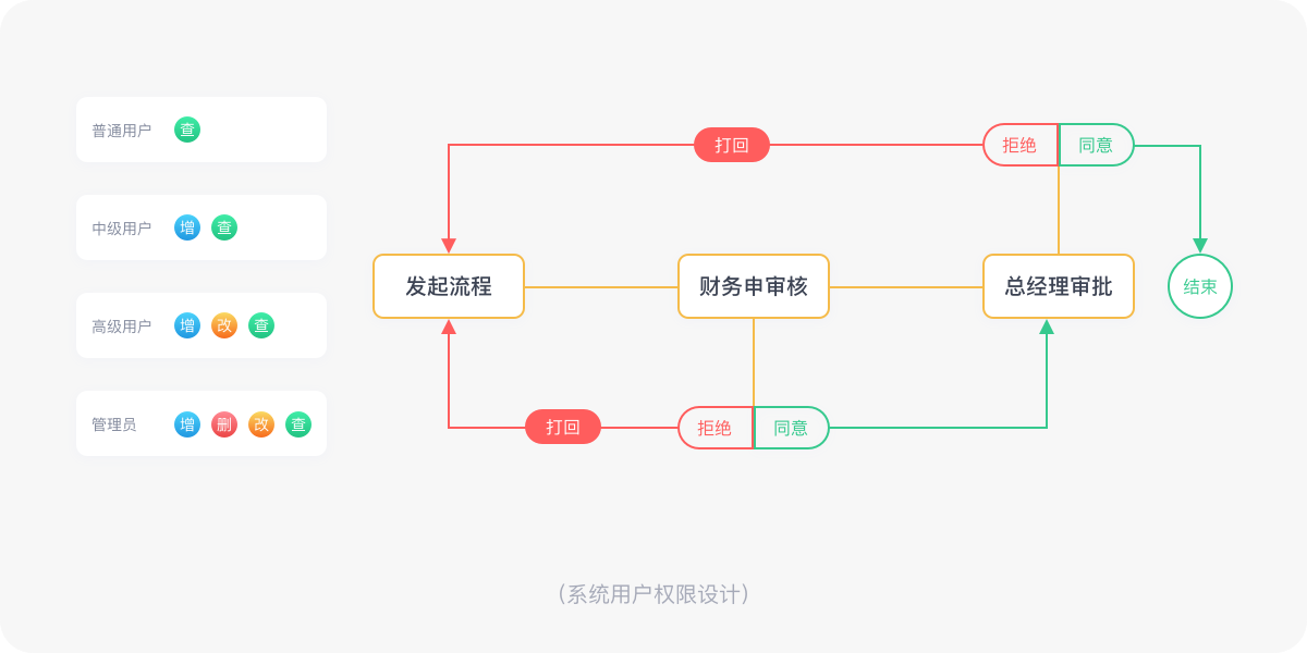 B端后台产品,一般会有角色权限的需求,这是系统产品的一个重要组成部分“组织架构”。组织架构换一种说法是“企业管理层的组成形式”,根据角色的主要任务和任职的不同,权限也会不一样,在不同权限的人员登录时,界面上显示有哪些不同,以及功能的可见性设置等。在做设计时要考虑有权限和无权限的界面显示的区别,尤其是涉及到复杂权限时。比如我发起一个费用申请,以“同意”和“打回”作为流程结点,根据企业制度设定,这个流程中会根连3种角色:发起人(我)、审核人(财务)、集团领导(副总及总经理)就涉及三个角色的权限,权限设计几乎串联着整个产品的脉络。