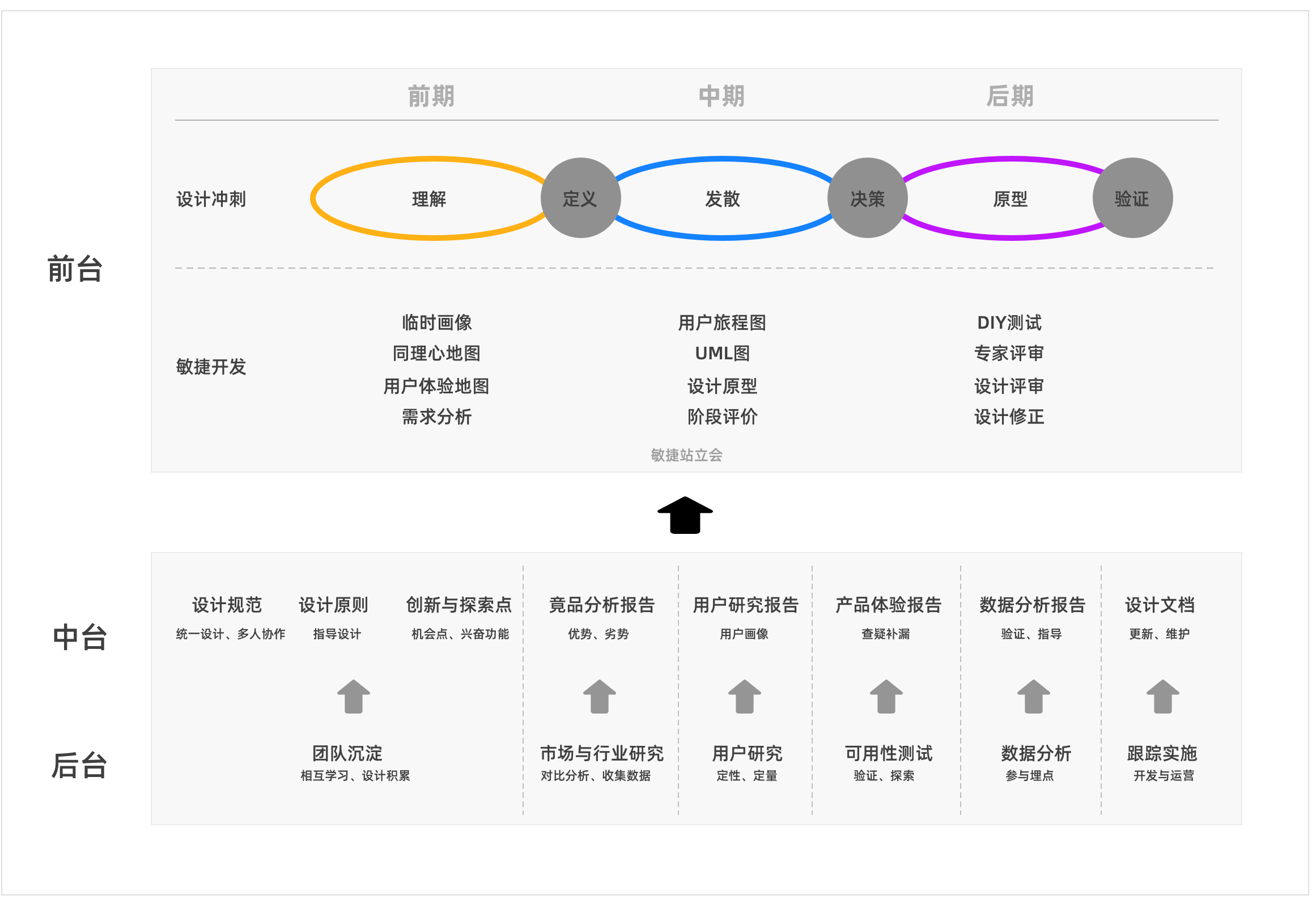 再说回前、中、后台的概念。最开始有一个“小前端,大中台”的概念是由阿里提出的,为了解决高耦合的结构。这里不同的是后台为持续性的设计工作、沉淀为可指导产品、建议产品的中台成果。借以支持前台的设计运作,而且这里的前台是可以支持“设计冲刺”或者“敏捷开发”两种产品实施模式的,为非瀑布流方式。