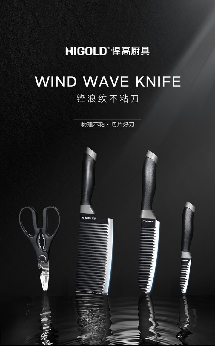 这套刀具叫“锋浪纹不粘刀”,它的特点是刀面上有一道道波浪一样的纹理,可以在切东西的时候达到不粘的效果。