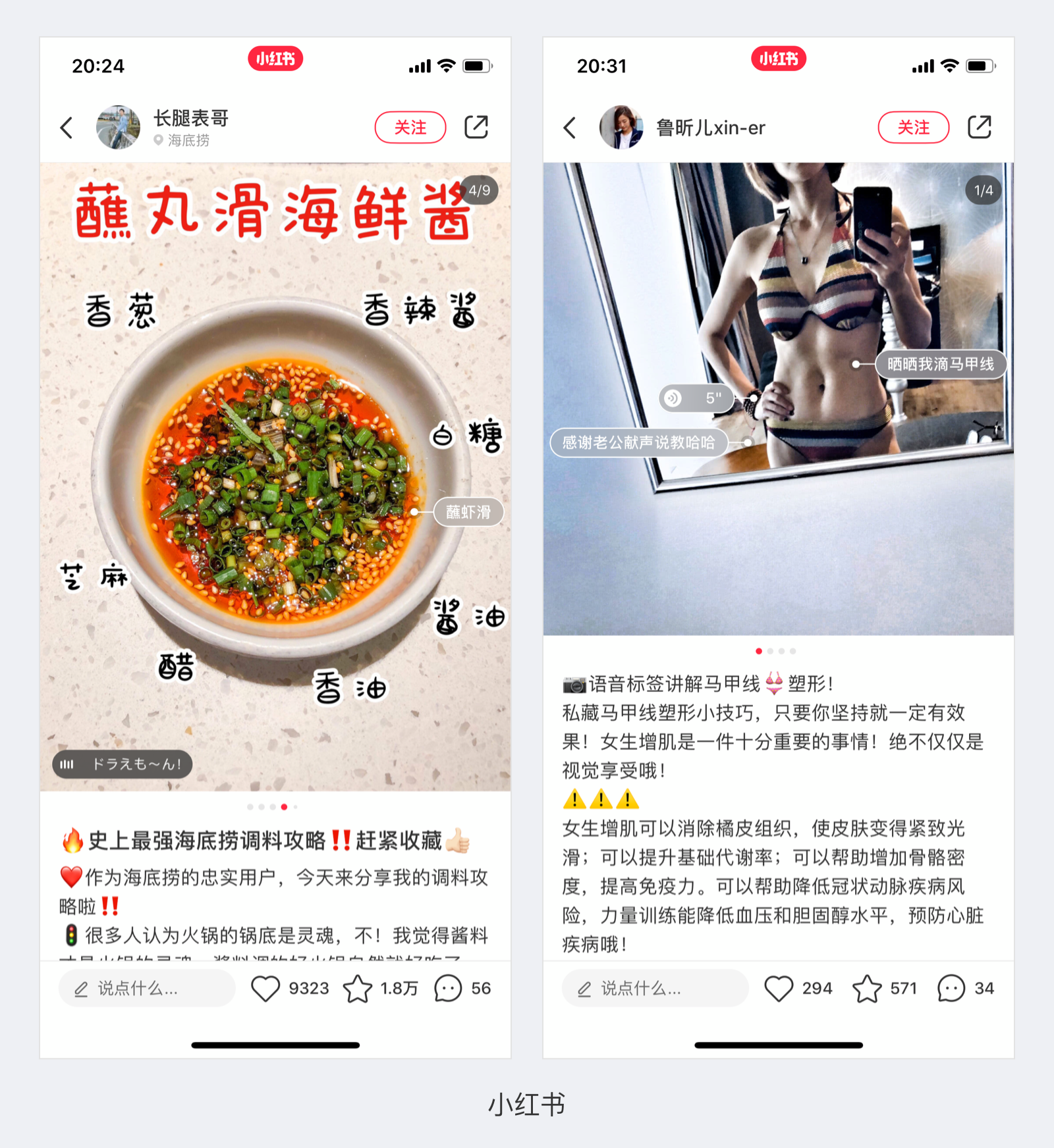 小红书的图片是可以加很多各种类型的标签,以白色描边+黑色半透明作为标签背景,同时有位置指向,但是需要用户点击一下才会出现,一张图片可以背景音乐、语音、文字等标签,这张图片就被赋予了多个属性,以图片为主的UGC和社交领域,这些属性就是用户之间的兴趣点,用户通过点击图片上的变迁找到自己感兴趣的点,很大程度上降低了用户的成本。