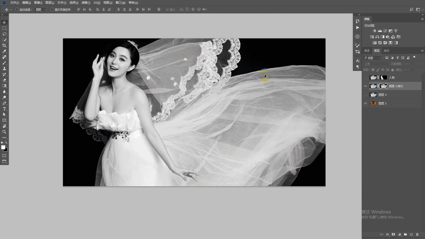 ①首先要明确人物与婚纱的关系,人物不需要透明,婚纱透明。那么就先把人物抠出来,方法用"技巧2,选择并遮住"。记得备份。