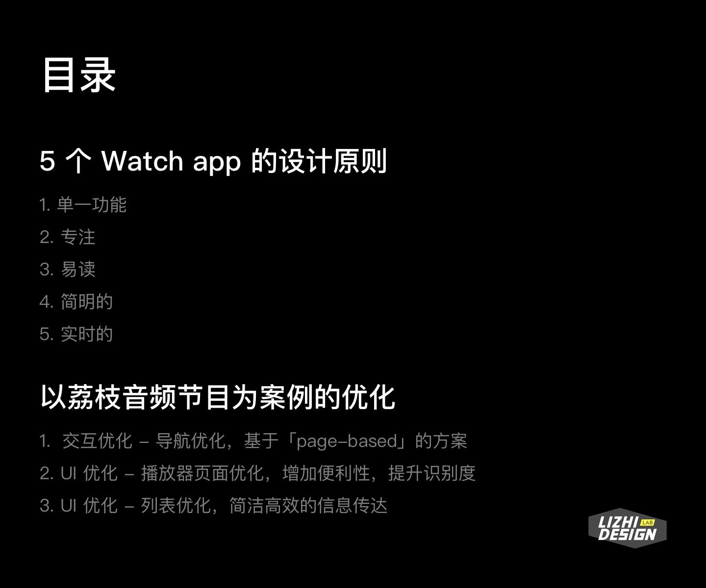 通过近距离接触苹果一线技术人员,还是获得了相当多的第一手资讯。因此总结了活动中与设计、交互相关的心得体会,以此文分享给大家。这篇文章分成两大部分,前半部分将分享 5 个 Watch app 的设计原则和技巧;后半部分则以荔枝的 Watch app 为案例,提出优化方案。