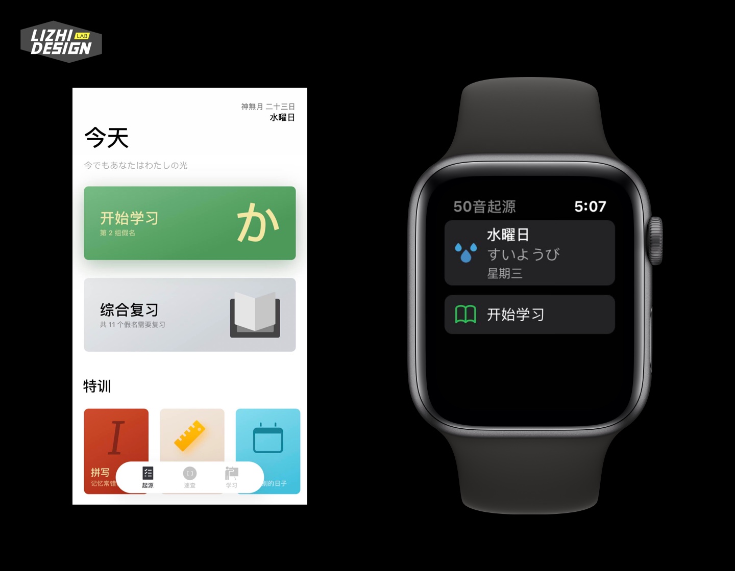 以「50音起源」这一款优秀产品为例,在手机上,它有起源、速查、学习、测试、词卡等多个功能模块,但是当它以 Watch app 呈现时,则只保留了词卡一个功能。