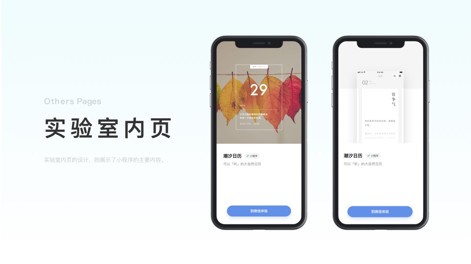 实验室的首页沿用了白+弥散阴影的手法,使用卡片作为载体承载内容;其次在头部加入了浅蓝色的波浪,让页面看上去更加丰富而不失简洁。内页的设计则展示了小程序的主要内容。