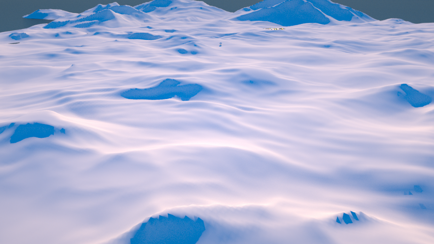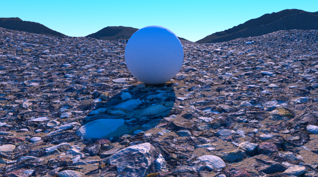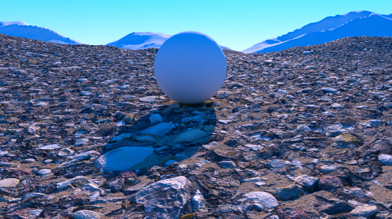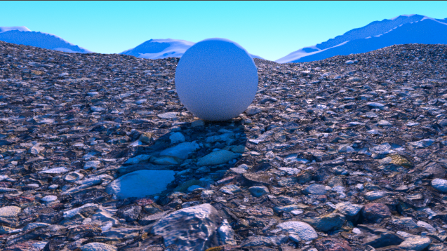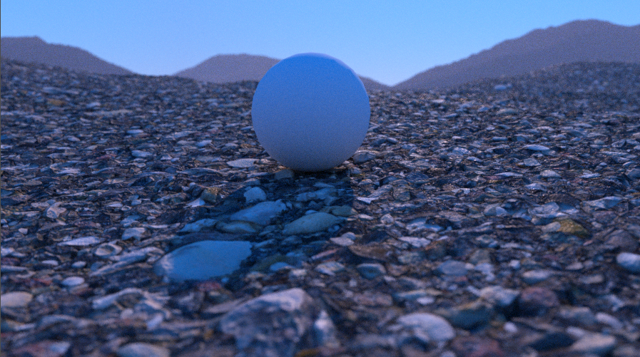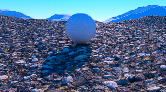 g. 为了使场景更有细节,再复制两份地面及材质,调整其材质参数,分别作为小石子及大石子,渲染效果如下: