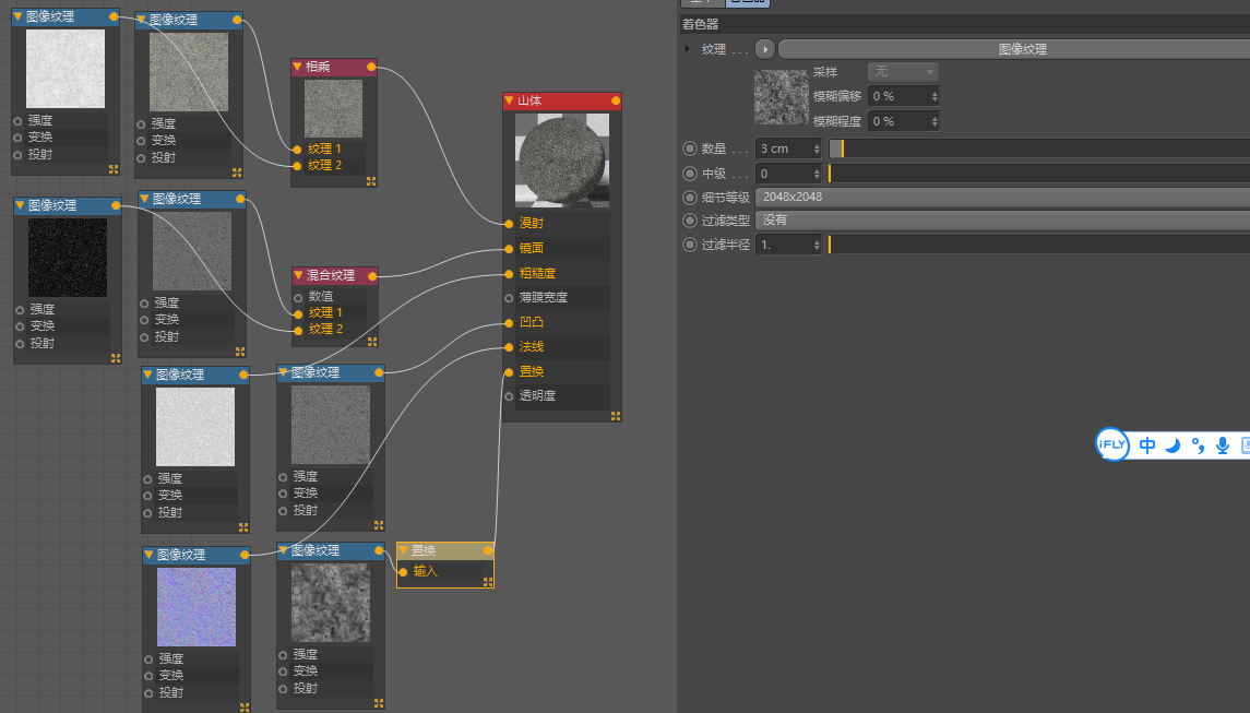 f. 新建OC光泽材质,导入下载好的地形材质,分别贴至对应通道,根据渲染结果,统一调整UV缩放: