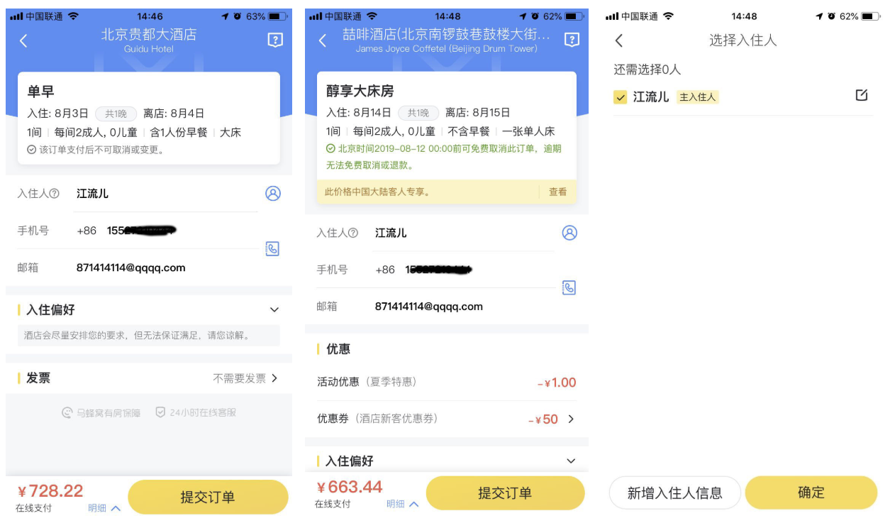 在某些APP中,用户填写一些信息时,系统会将这些信息保存下来,以便用户下次使用时直接复用。例如马蜂窝APP,就会将用户填写的入住人信息保存下来,供用户下次使用。
