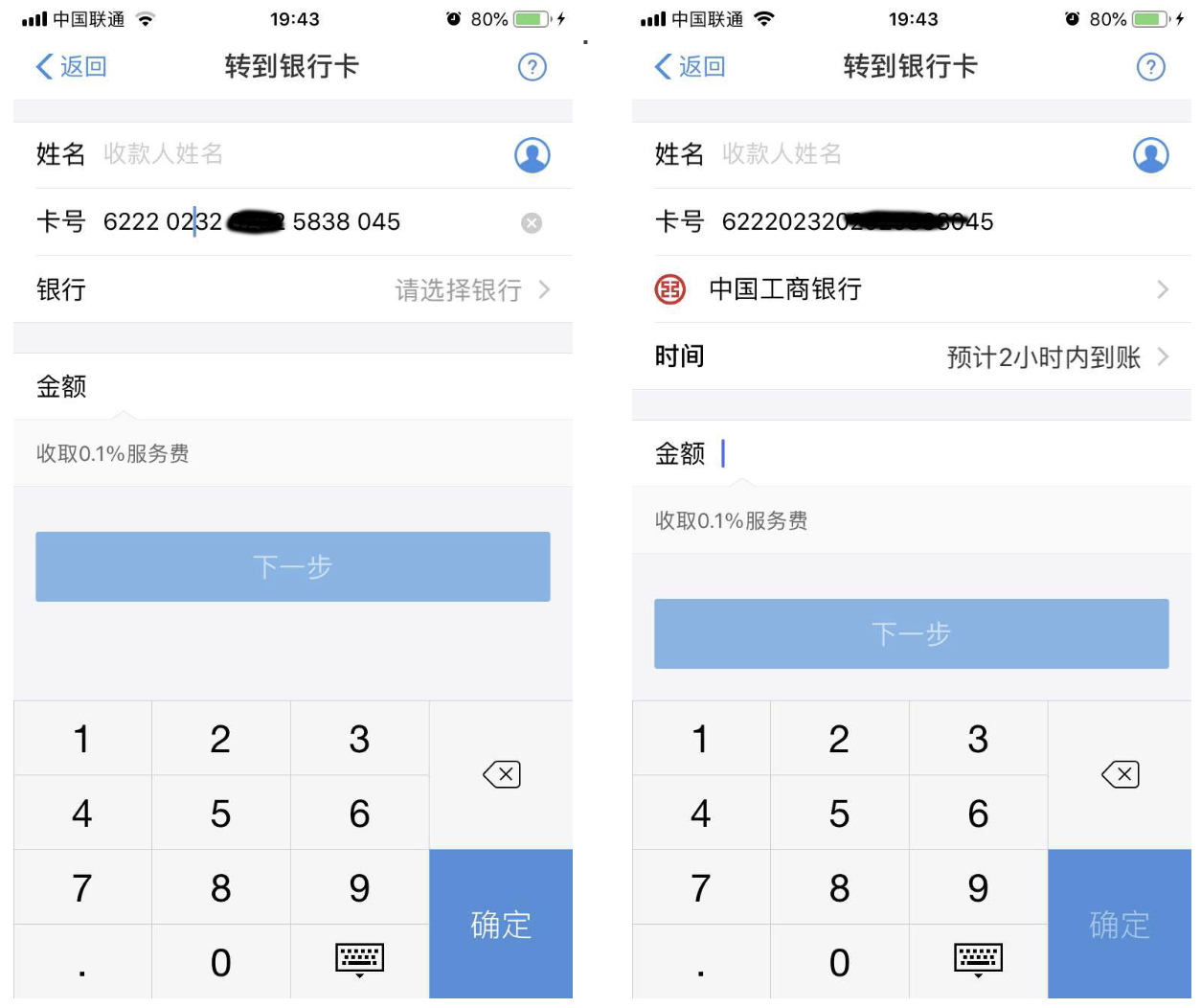 1、用户使用支付宝APP对银行卡转账时,APP可以通过输入的卡号,识别该卡所属银行,并自动选择银行。这样设计不但能帮助用户快速完成选择,而且能避免用户选错银行,从而最大化的避免用户汇错款或汇款失败。