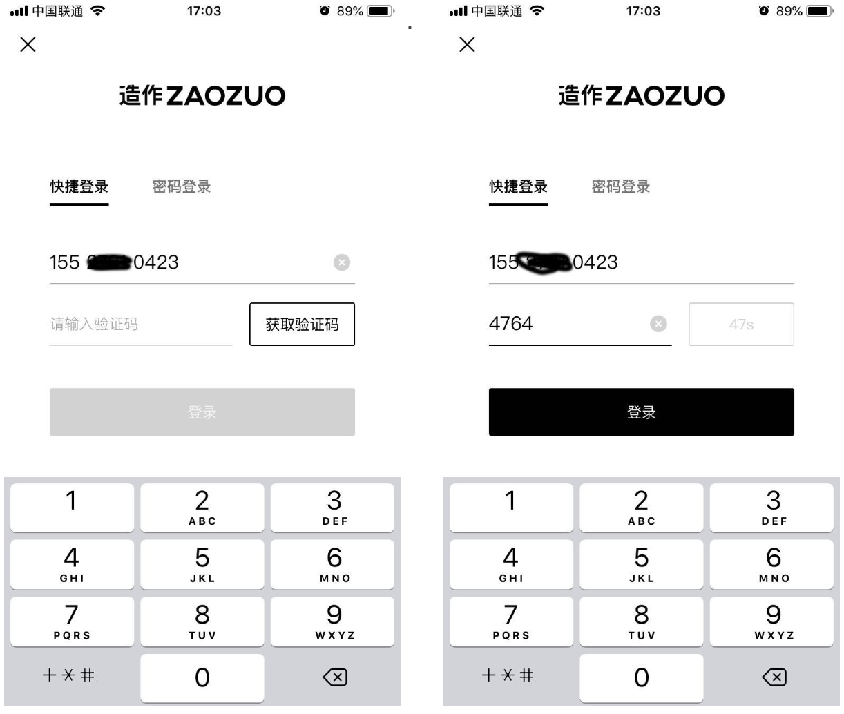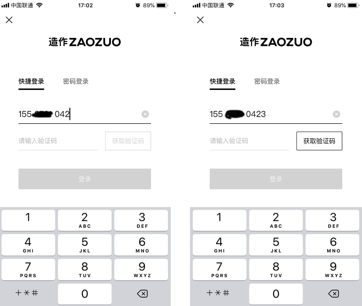 填写手机号,几乎是所有APP中必要的操作,造作APP在登录环节(如图示),当用户填写手机号时,手机号输入框限定了只能输入11位阿拉伯数字,不能输入更多数字,只提供数字键盘,且手机号格式用XXXX XXXX XXX的间隔方式。这样的设计,最大化的避免用户出错,提高产品的易用性。当然,用户输入他人的或者无效的手机号是无法避免的。