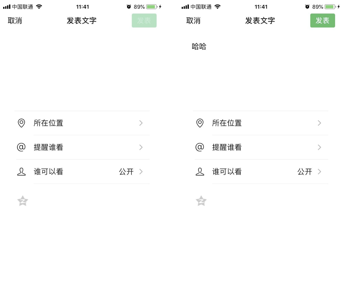 2、用户使用微信APP发朋友圈时,输入框输入字符后,发送按钮由置灰态自动变为可点击态。这样设计可以有效的避免用户发空状态。