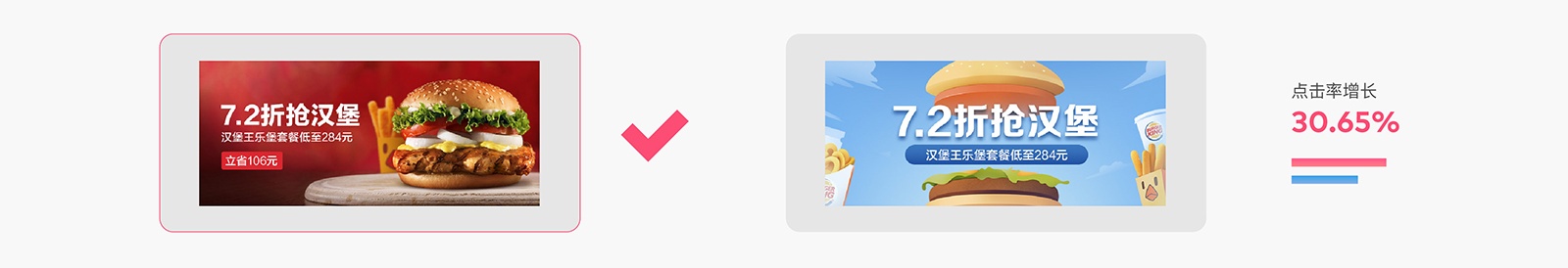 主要原因也是认知惯性,快餐类长期使用精美的食物实拍做广告设计,而精美的食物照片显得更加诱人,让人更有食欲,同时也满足了人性的需求(食欲),因此插画风格虽然看起来更新颖,但点击率却没有传统做法来的高。