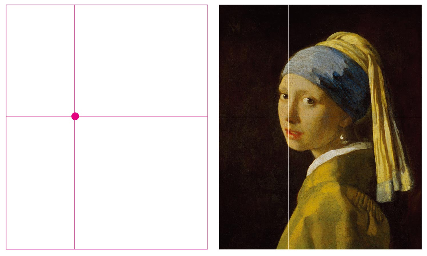 人臉的視覺焦點是嘴巴和眼睛,此作品中維梅爾捨棄數學中心,利用主角的眼鼻創造視覺中心。