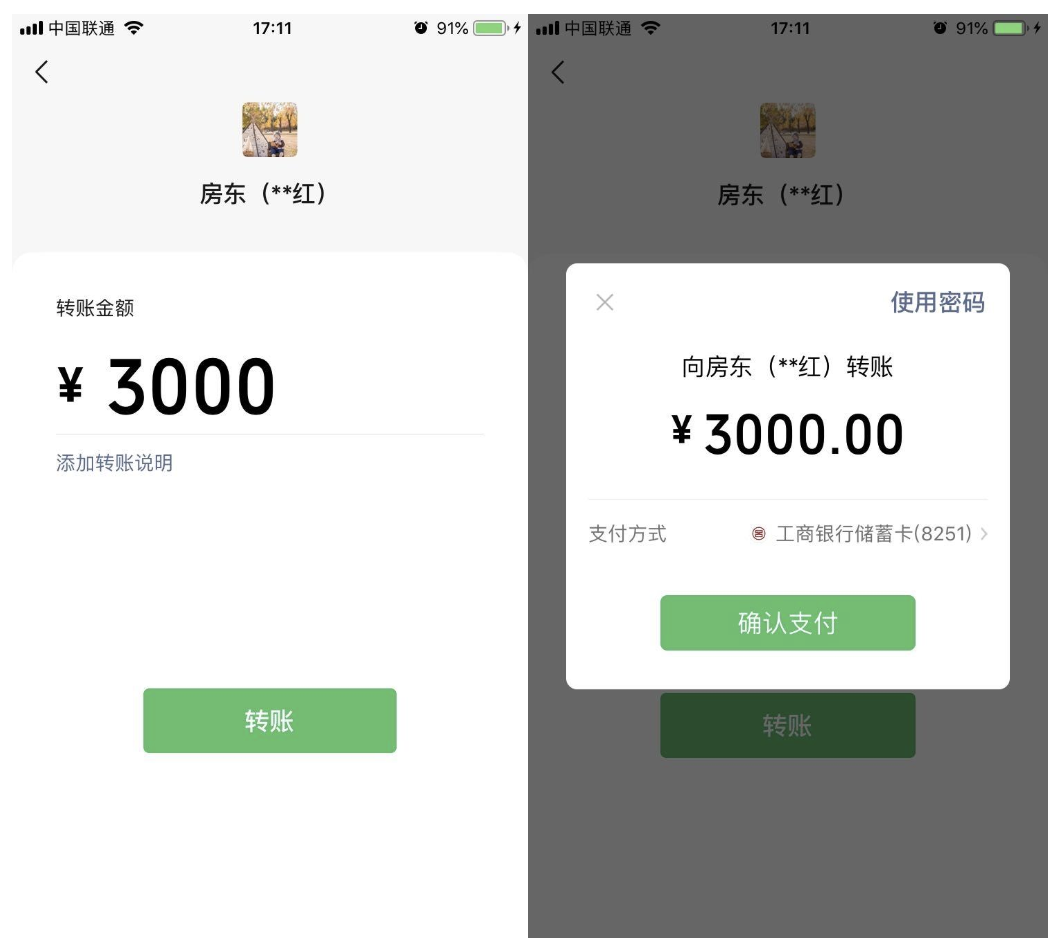 2、在用微信给朋友转账交互流程中,当输入金额后,在弹出的支付弹窗中,会将输入的金额显示出来,这样的设计,可以让用户再次确定输入的金额是否有误,而不需要用户关闭支付弹窗去确认输入金额信息。