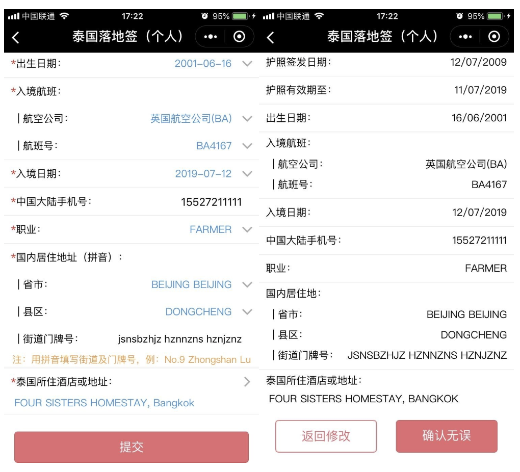 3、有时候我们需要填写很复杂的表单,并且在表单填写完成后,需要仔细核对一下信息是否正确,才会提交表单。在一款在线办理签证的小程序中,就运用到了辨认比回想重要的设计法则,在用户输入完表单的全部信息,点击提交后,会进入新的信息确认页,在信息确认页,输入的信息不能修改,这样用户就可以再次确认输入的信息是否有误,从而降低用户出错率,避免用户产生怀疑、焦虑等情绪。在重要且复杂的表单提交流程中,用户无法确定已经输入的信息是否存在误操作导致丢失或出错的情况,所以一定要增加信息确认环节,提升用户体验。