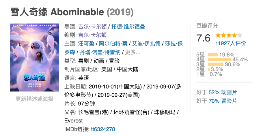 目前,《雪人奇缘》已入选2020奥斯卡最佳动画长片初选,豆瓣评分目前为7.6分。