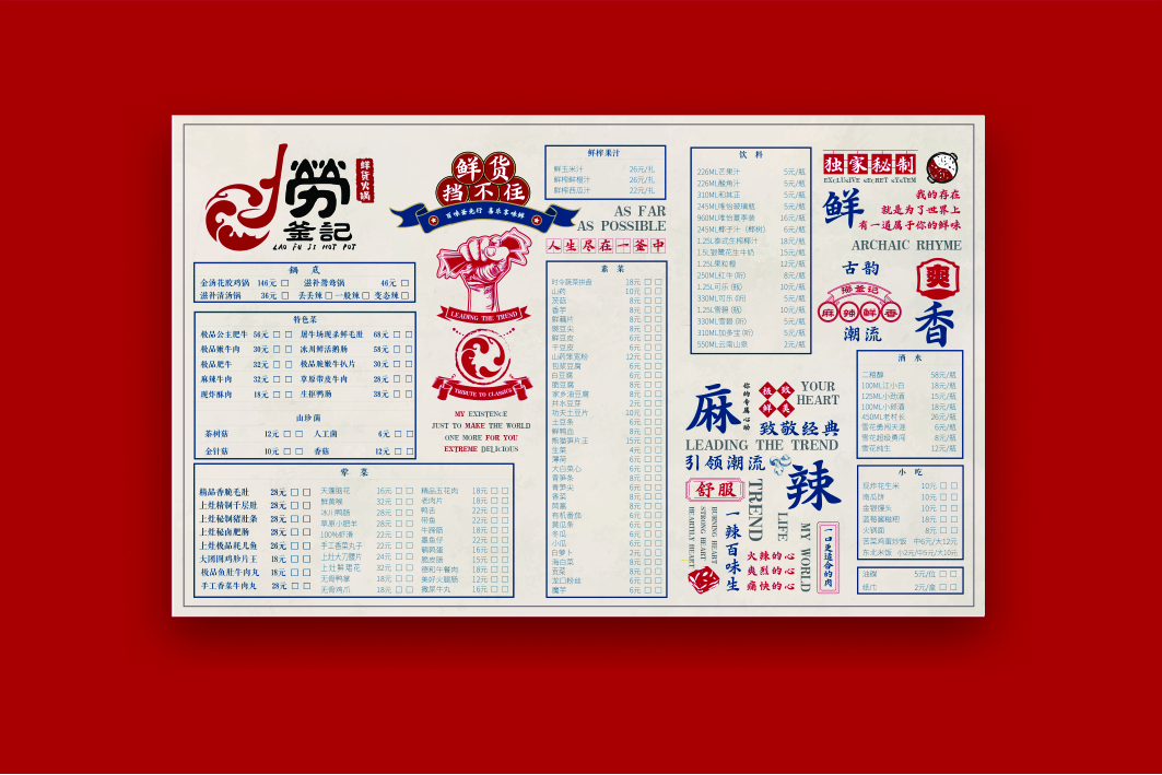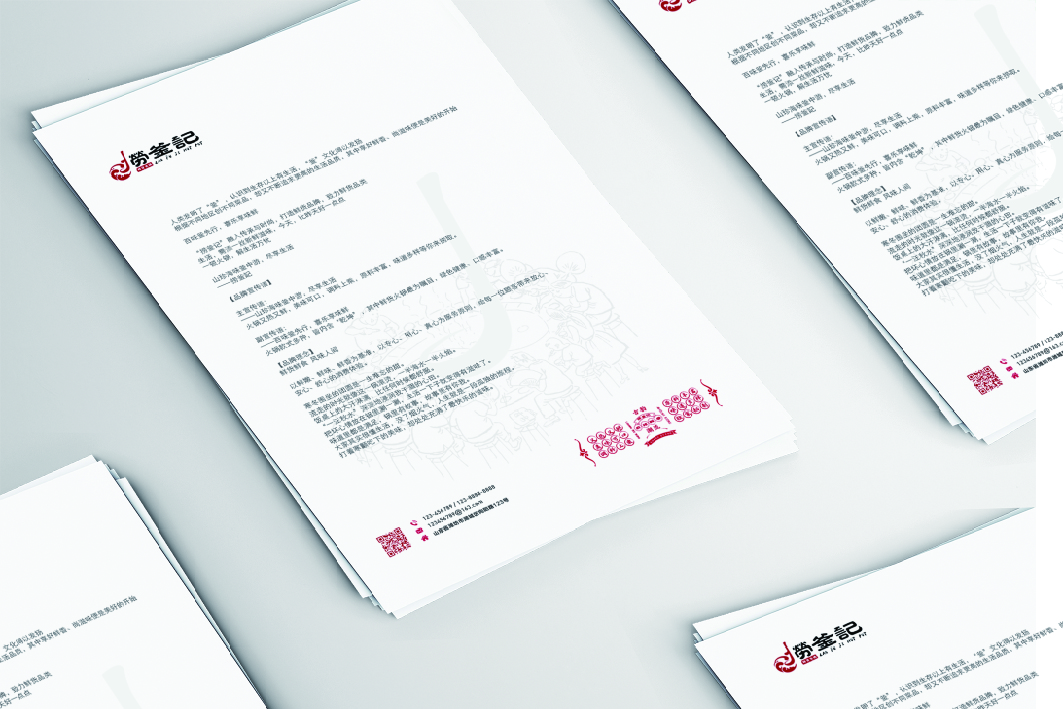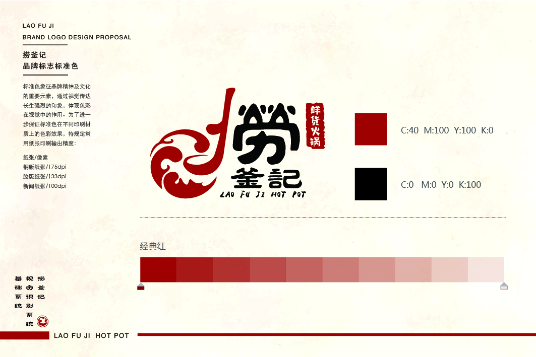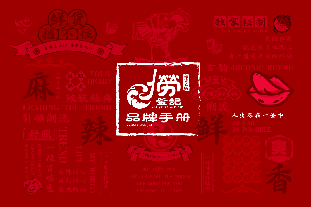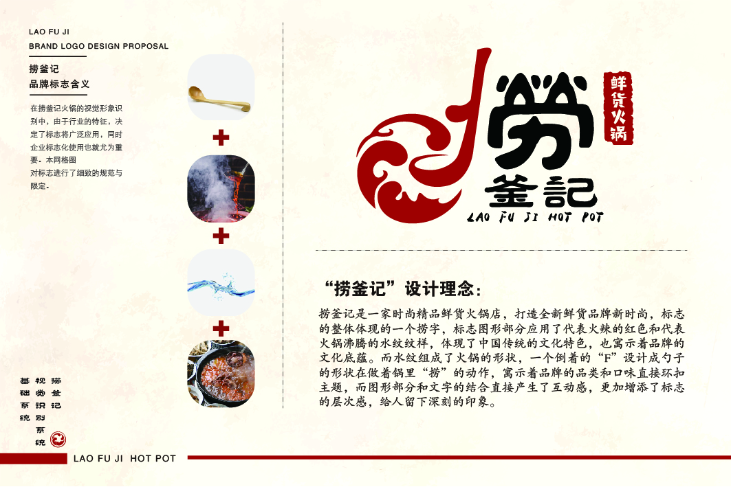 捞釜记是一家时尚精品鲜货火锅店,打造全新鲜货品牌新时尚,标志 的整体体现的一个捞字,标志图形部分应用了代表火辣的红色和代表 火锅沸腾的水纹纹样,体现了中国传统的文化特色,也寓示着品牌的 文化底蕴。而水纹组成了火锅的形状,一个倒着的“F”设计成勺子 的形状在做着锅里“捞”的动作,寓示着品牌的品类和口味直接环扣 主题,而图形部分和文字的结合直接产生了互动感,更加增添了标志 的层次感,给人留下深刻的印象。