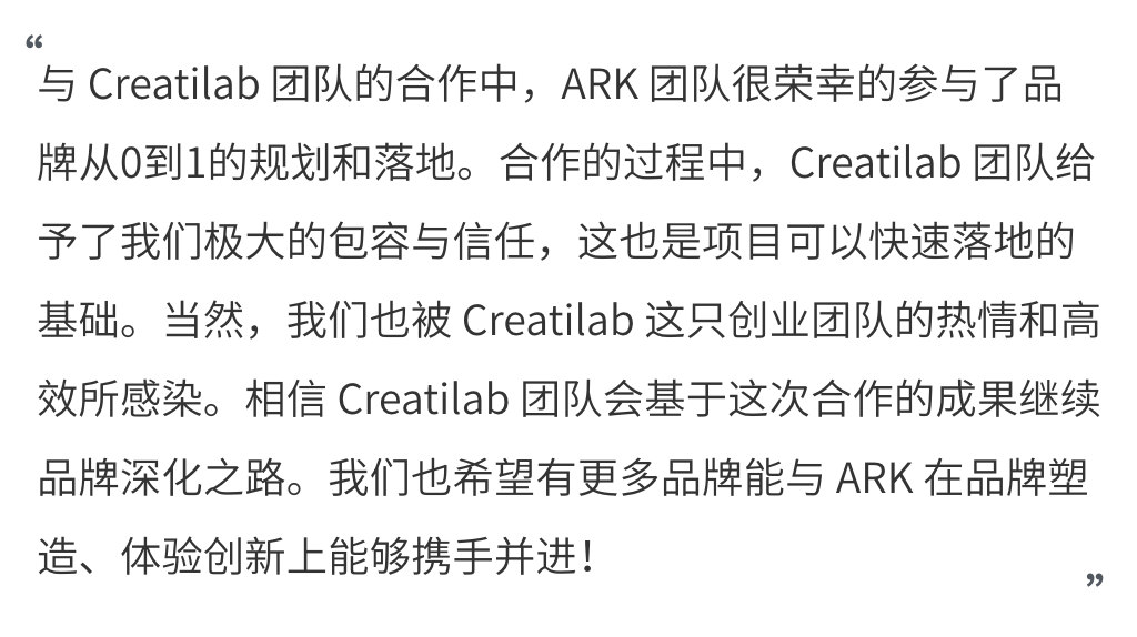 ARK与Creatilab的合作,从用户洞察到品牌定位,从场景到服务,不仅探索了美妆护肤这个复杂市场中的突破机会点,也是对拥有创新基因与胆识的本土美妆品牌的一次助力。ARK是为改变而存在,我们也会为任何想要创造改变的品牌尽全力贡献自己的价值。