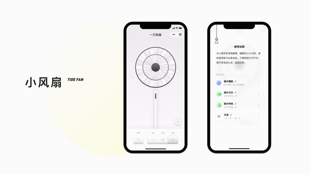 整个小程序最难的地方,是开发哥哥写风扇叶子的转动。当切换档数时,开发哥哥需要让扇叶的转动速度进行加速和减速,而非粗暴的速度切换。最后实现的效果非常流畅,开发哥哥赛高!最后再录制风扇的三档声音和按钮声,就完成啦。