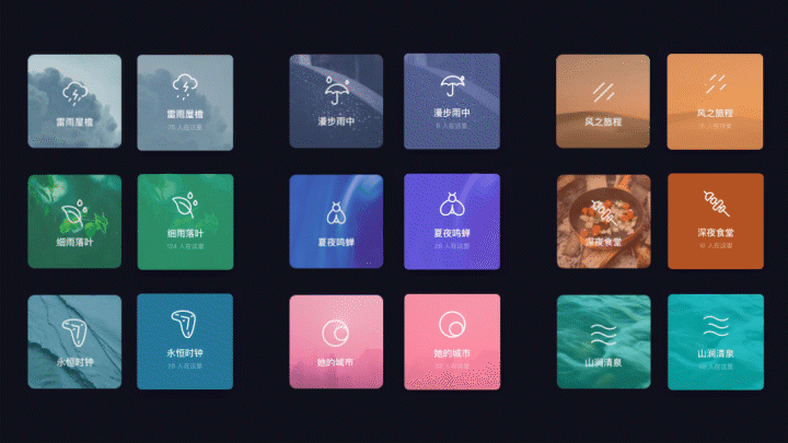 根据声音的名称与所选的场景图,我需要绘制动态图标。由于使用GIF,形式上会受到比较大的限制,所以做了一些小的创意点,例如吃串串、风的抽象表达、雨滴落到伞上的抖动、小虫子抖出花粉等。