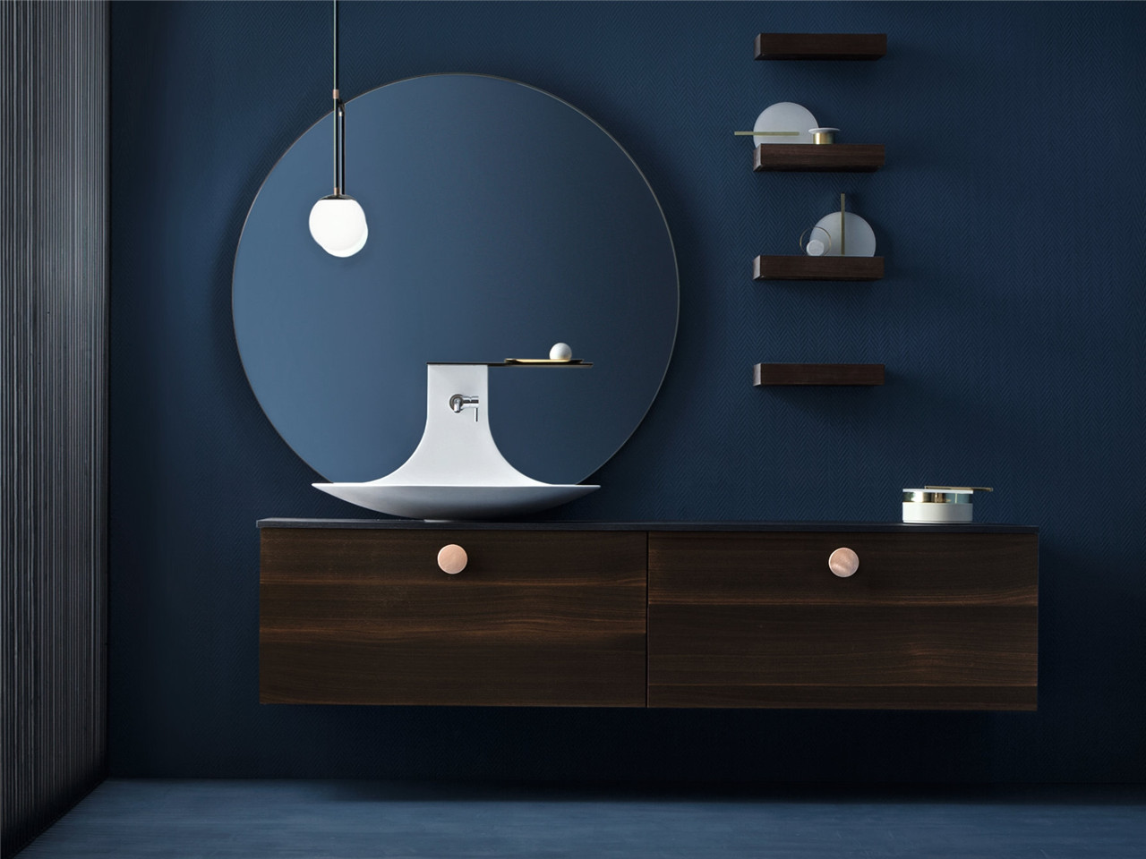 Maori系列浴室家具将日式风格与简单而干净的线条相结合,通过产品细节上的考究设计来呈现浴室的真正灵魂,比如说:柜门的厚度、玫瑰金色的饰面、独有的软性漆面和精制的桉木结构。