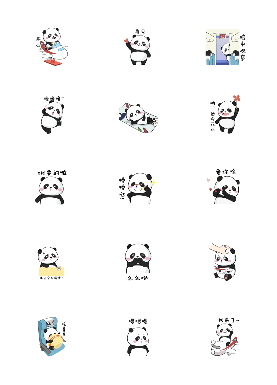品牌表情包在设计中有一点不能忽视,不能完全脱离品牌去迎合用户喜好,表情内容虽然可爱但却和品牌毫无关联。反之也不能完全无视用户只关注品牌,强硬加入过多品牌元素让用户反感。简立方将川航元素巧妙植入到了表情包里,拿着川航飞机模型一脸委屈模样的三优、在飞机座椅上捧着碗吃饭的三优、机舱里暗中观察的三优…航空元素就这样不知不觉和憨态可掬的熊猫融合在一起。