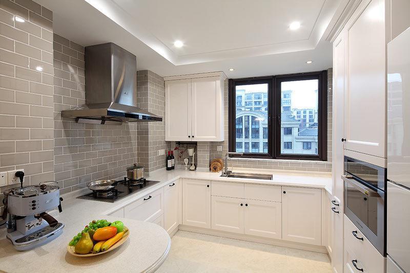 L型厨房布局将空间充分利用,电器一体化橱柜,地柜,吊柜,收纳空间充足。工字型灰色瓷砖上墙,日常清洁更方便。