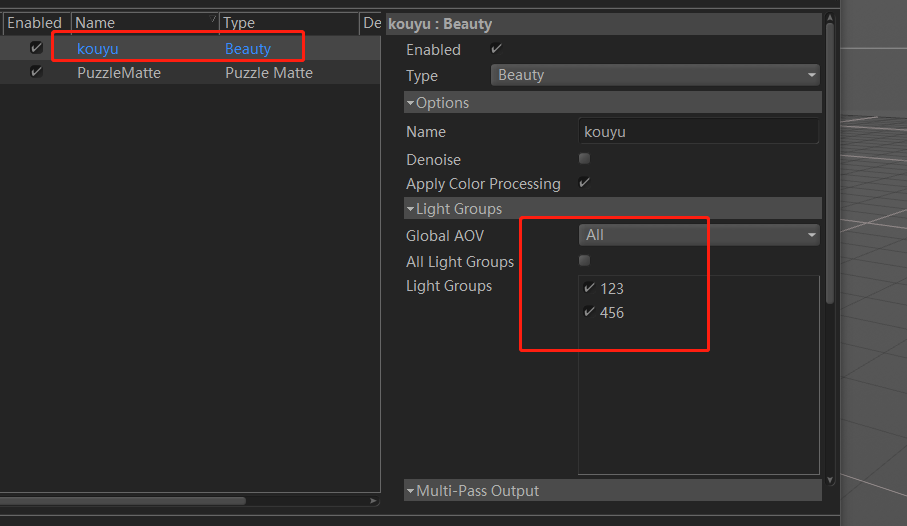 名字。灯光不会有单独的通道,他们在beauty的下面勾选后可以在渲染视窗里查看