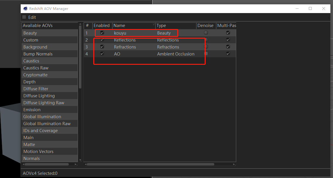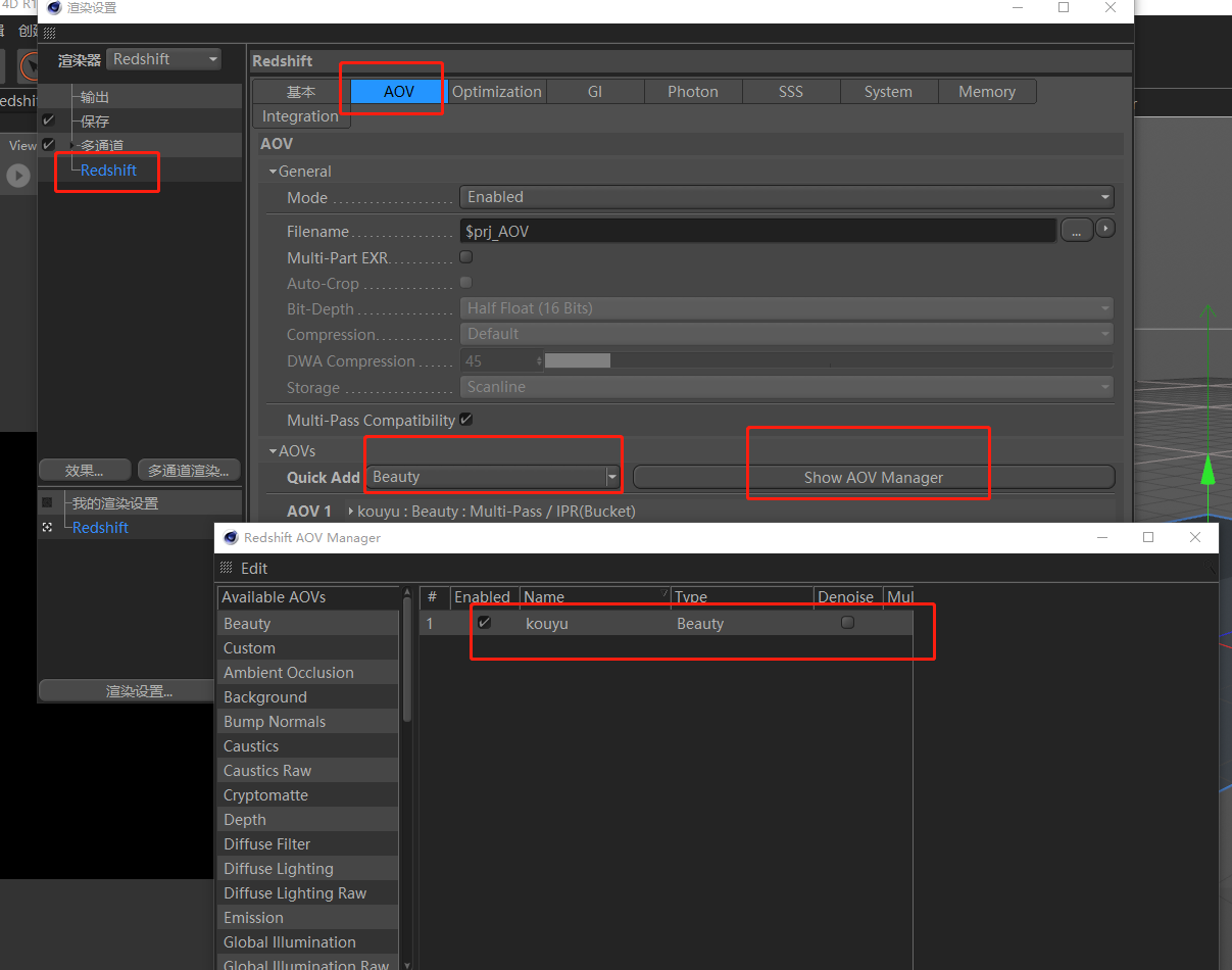 1.redshift的多通道aov在渲染设置里面,里面有一个AOV的管理面板
