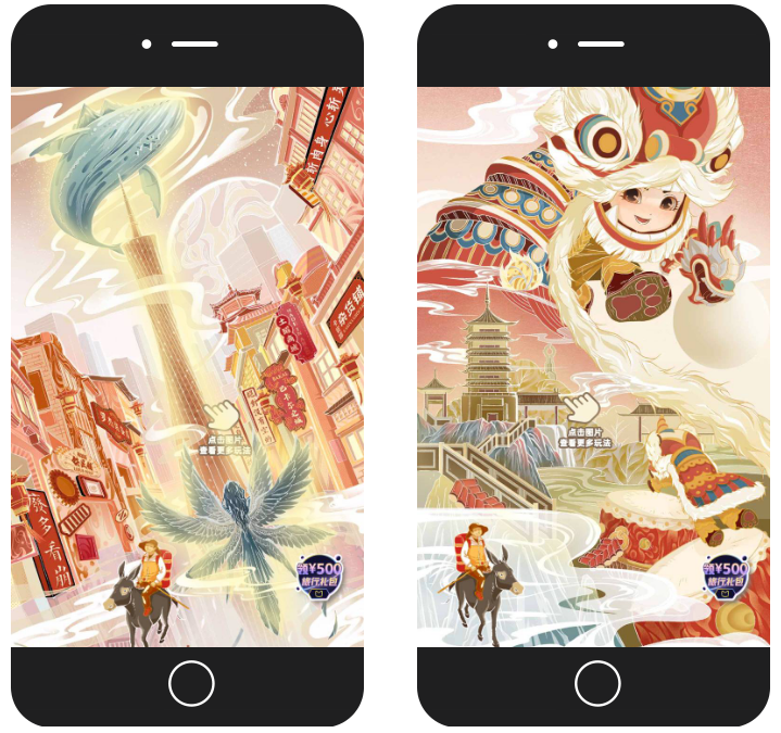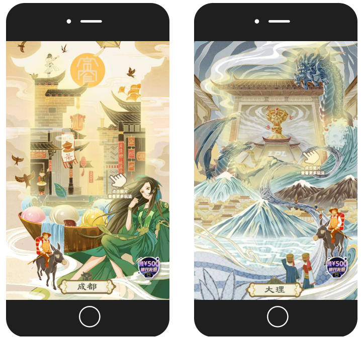 设计上,采用了仙境风漫画风格,将城市最有名的特色在主图中进行展现,并有古装造型的俊美人物穿插其中,联手腾讯游戏,则通过数字内容与文旅融合的方式,为人们提供了一种穿越城市时间与空间的视角,以当代年轻人喜闻乐见的方式,大力弘扬中华优秀传统文化。
