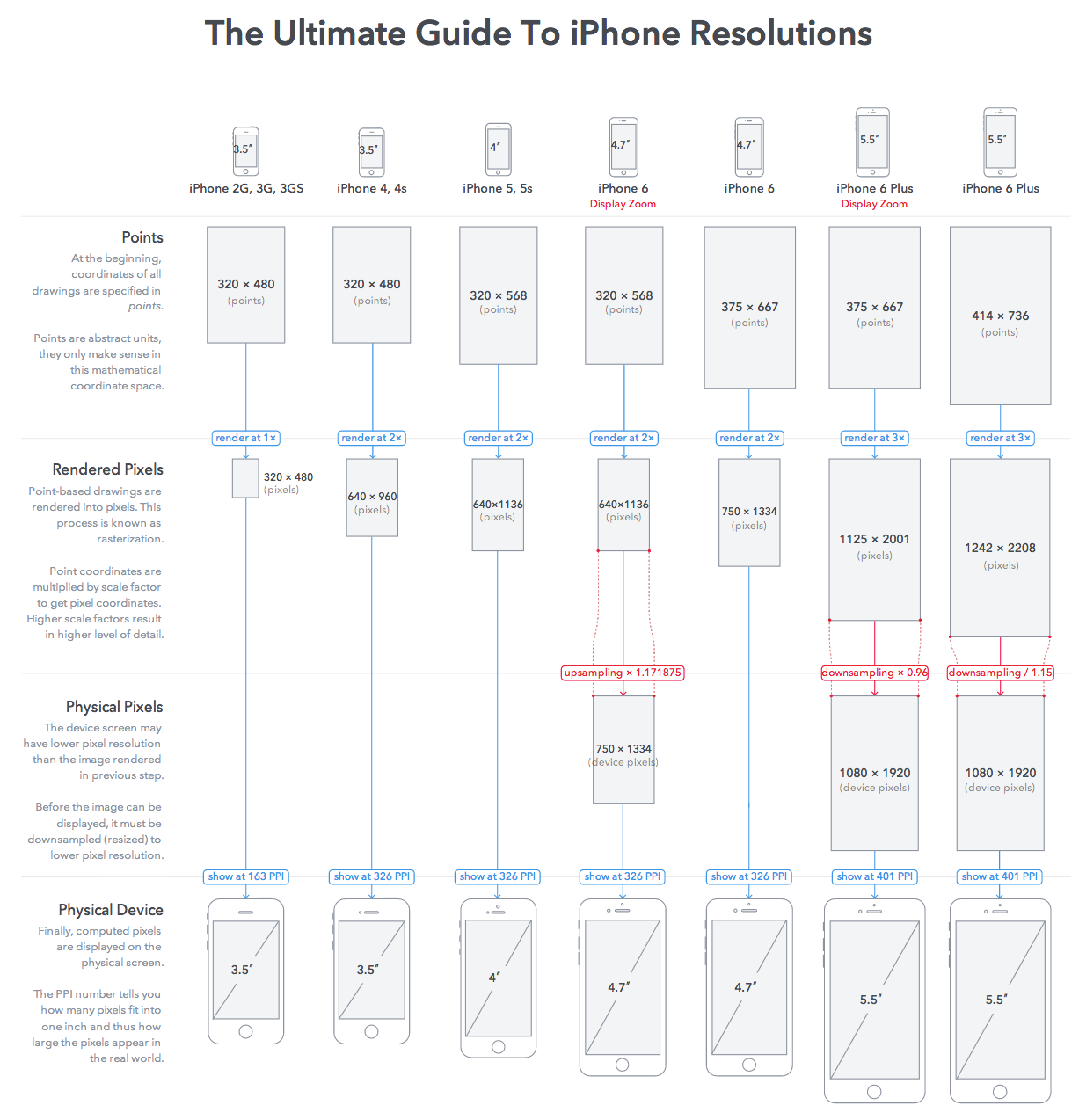 然后呢,iPhone 6/7/8是适配@2x,iPhone x是适配@3x,上图没有x的尺寸,这张图就很详细了。主要还是看px和pt。