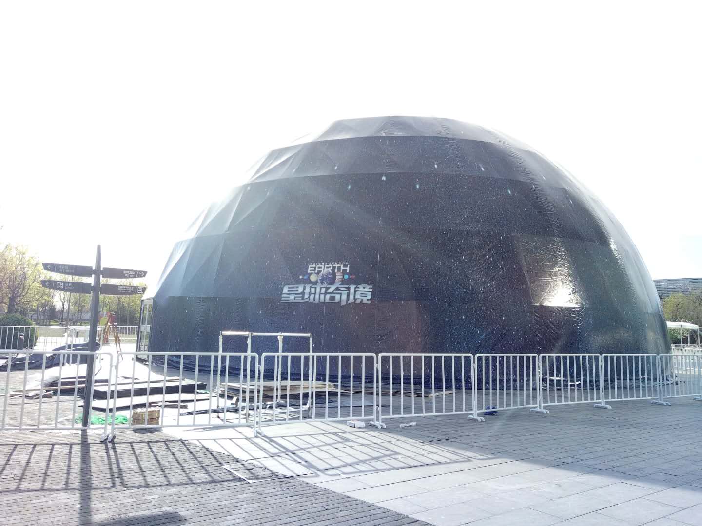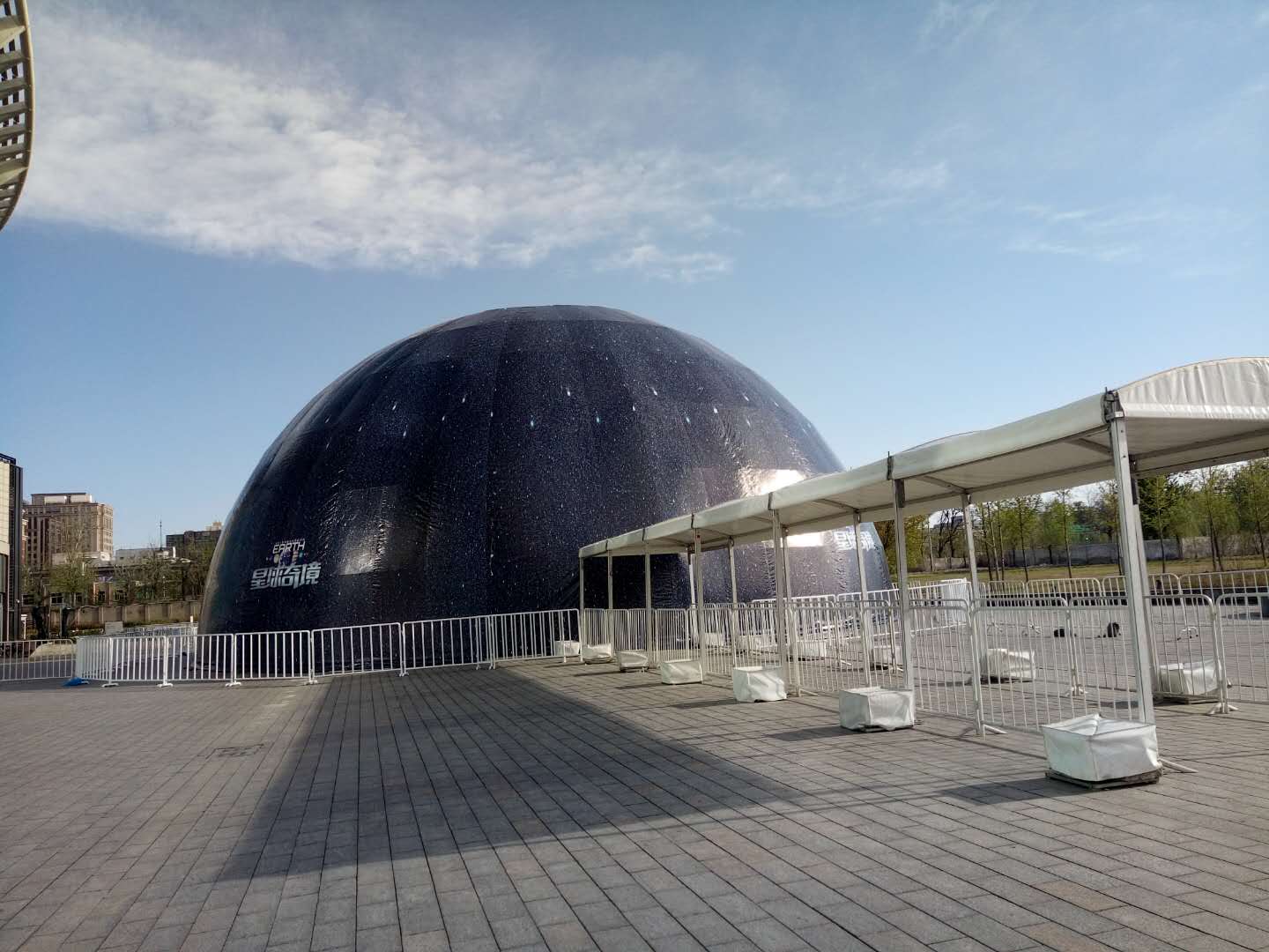 那是一个在外看是一个大的球形,球形上有层布,据说是PVC篷布并采用了繁星喷绘,致使无论白天还是黑夜配合灯光,都能达到给人置身外空的体验效果。