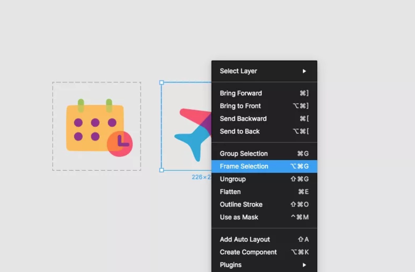 我们甚至还可以把普通的图层通过菜单直接转为Frame,比如,我可以把下图的区域通过执行右键菜单“Frame Selection”转化为独立的画板,这个时候问题就解决了,这个透明frame直接导出的图就是透明的。