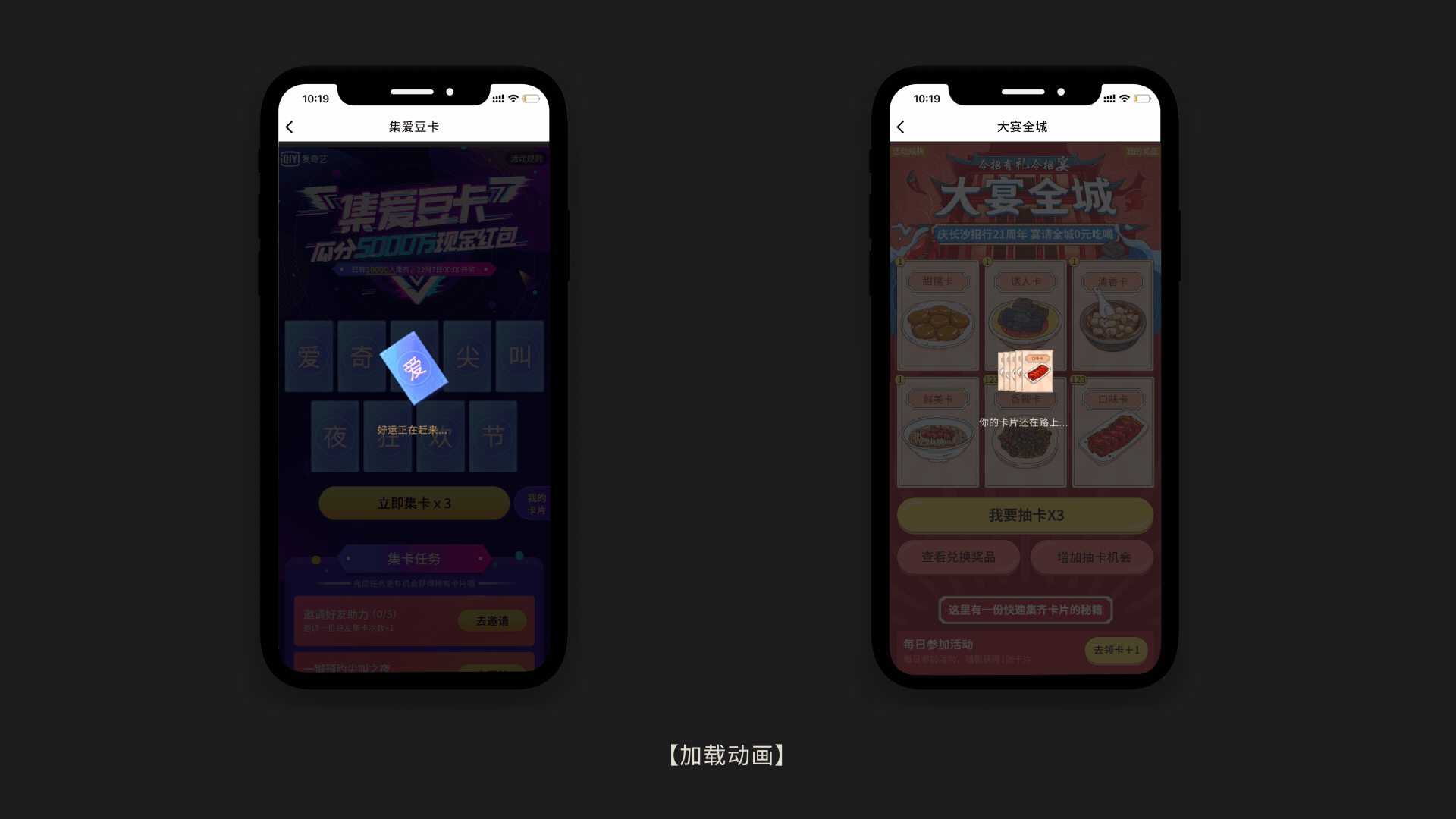 加载动画作为用户活动的第一印象,是相当重要的,互联网有一个著名的‘8秒原则’,用户等待页面加载超过8秒,70%的用户会选择放弃。在火爆的营销集卡活动中,当因网络延迟等问题,导致卡片加载过慢时,最好的做法是增加一个有趣的加载动画,缓解用户焦虑的情绪。