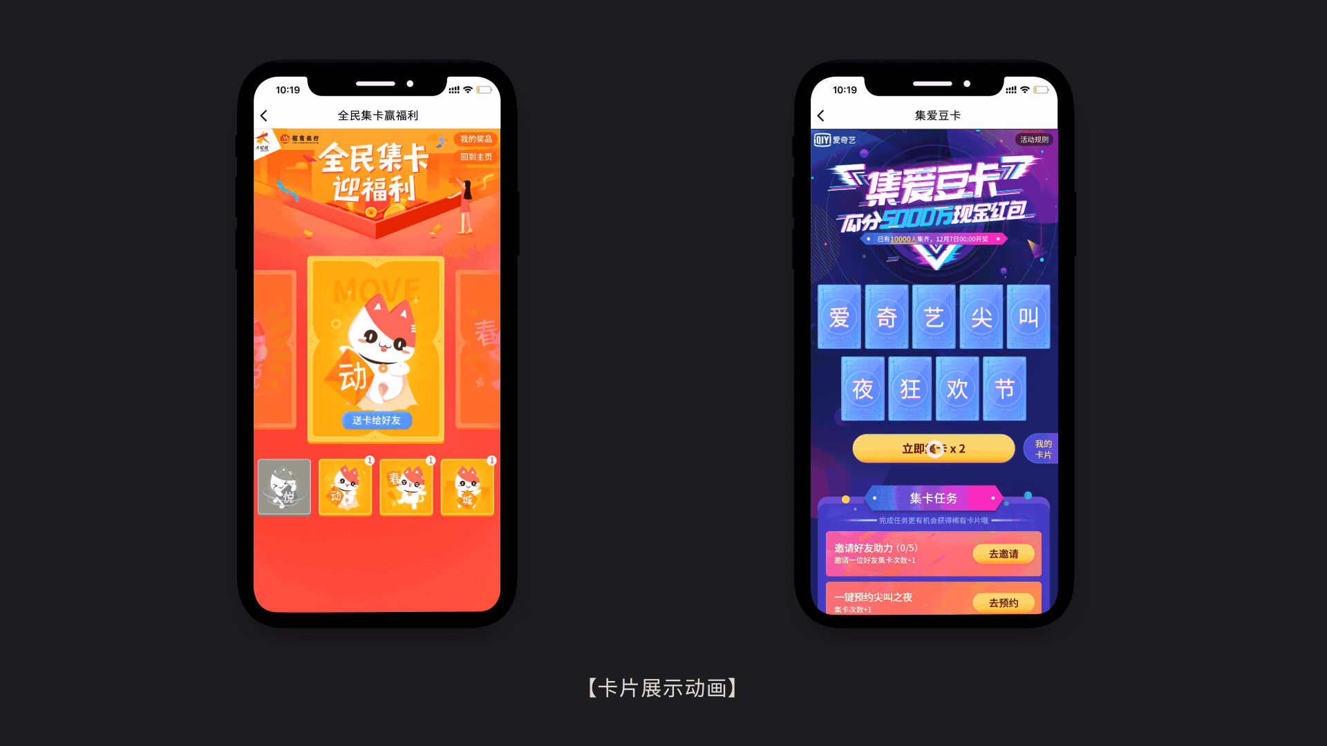 卡片获取是整个集卡活动的核心,也是用户在完成所有动作之后的结果展示。在动效上可采用先发卡然后再翻开卡片展示结果的方式,相比于直接弹出抽卡结果,这样做的好处是使每一次获得卡片的过程都有开奖式的期待。再配合一些礼花,彩带等庆祝类型的动效氛围,能够给用户营造一种沉浸式的交互体验,增加集卡乐趣;