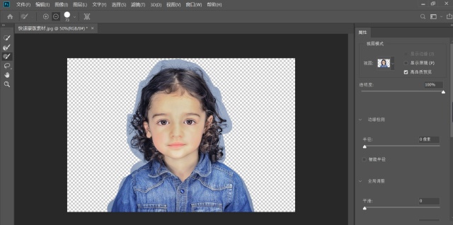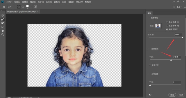 6、接下来选中调整边缘画笔工具,涂抹带有背景图层的位置,设置数值和效果如下图▼