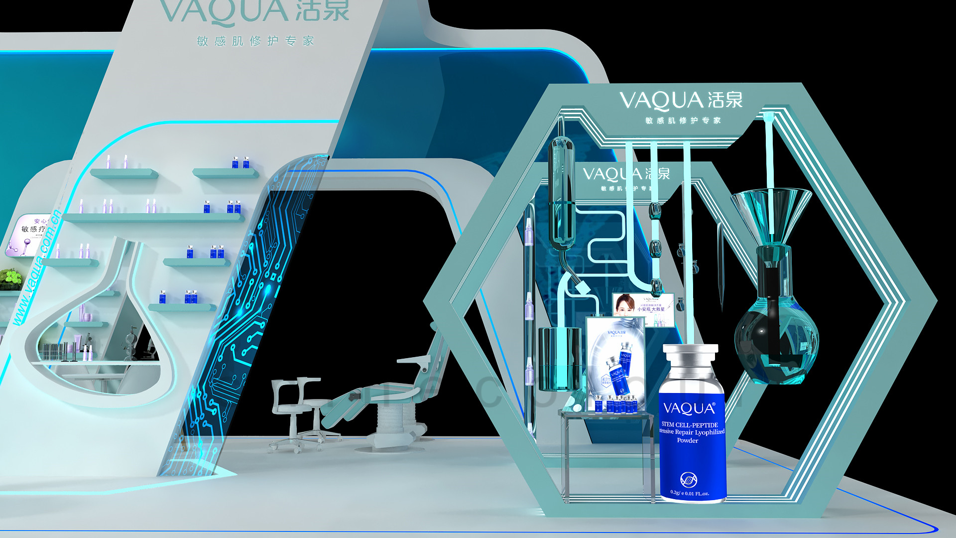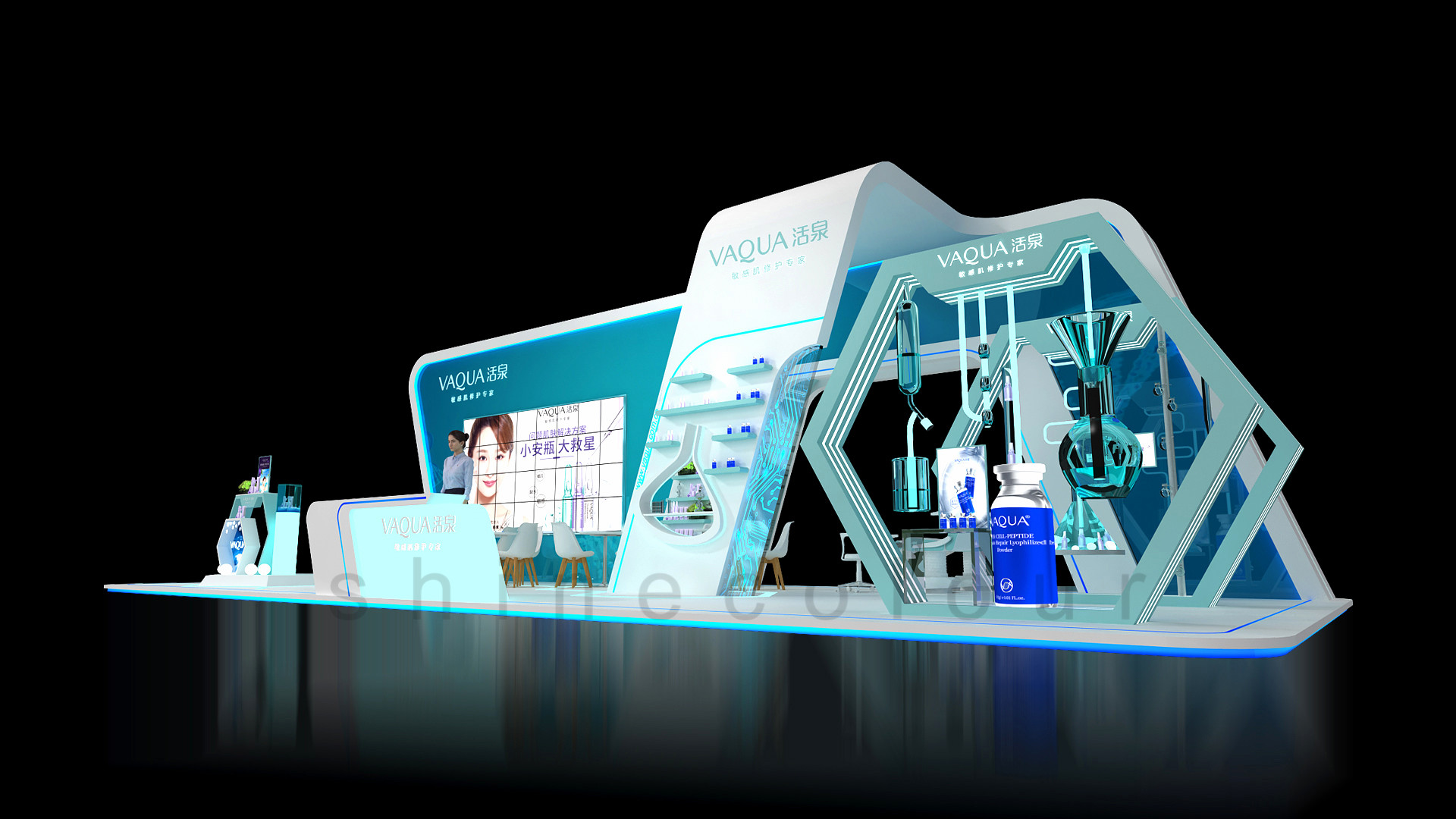 (2)展台整体采用直线加圆角的流线造型元素,大大小小的六边形是分子链元素的提取与重组的效果呈现。