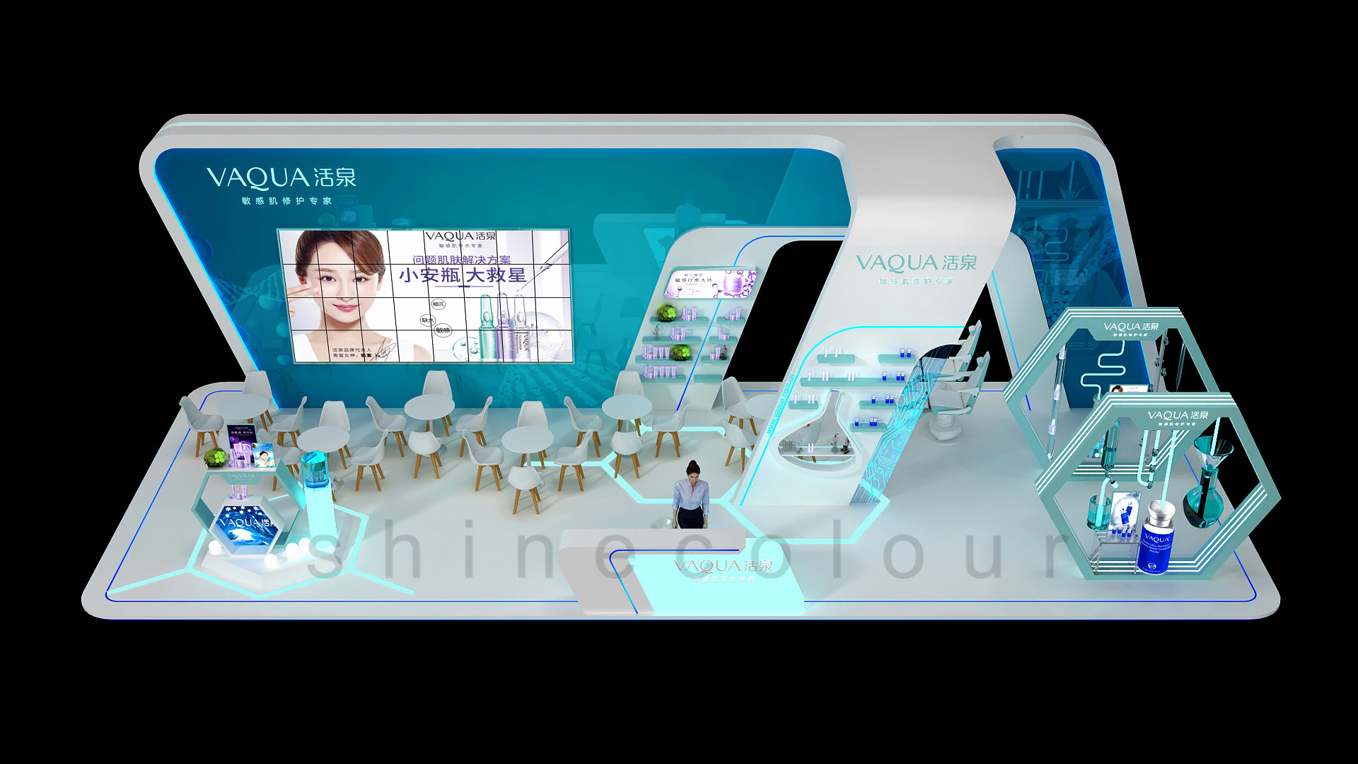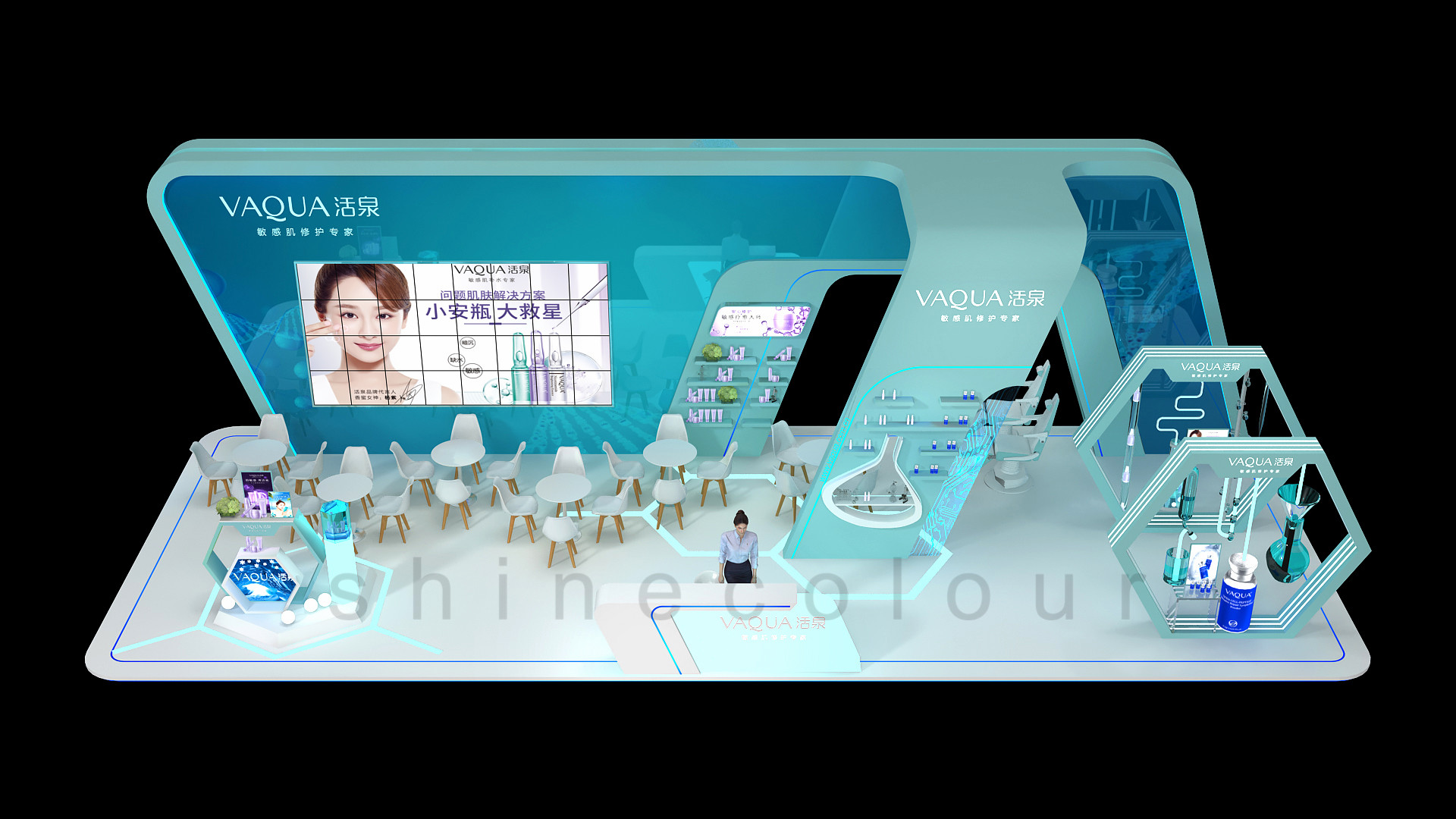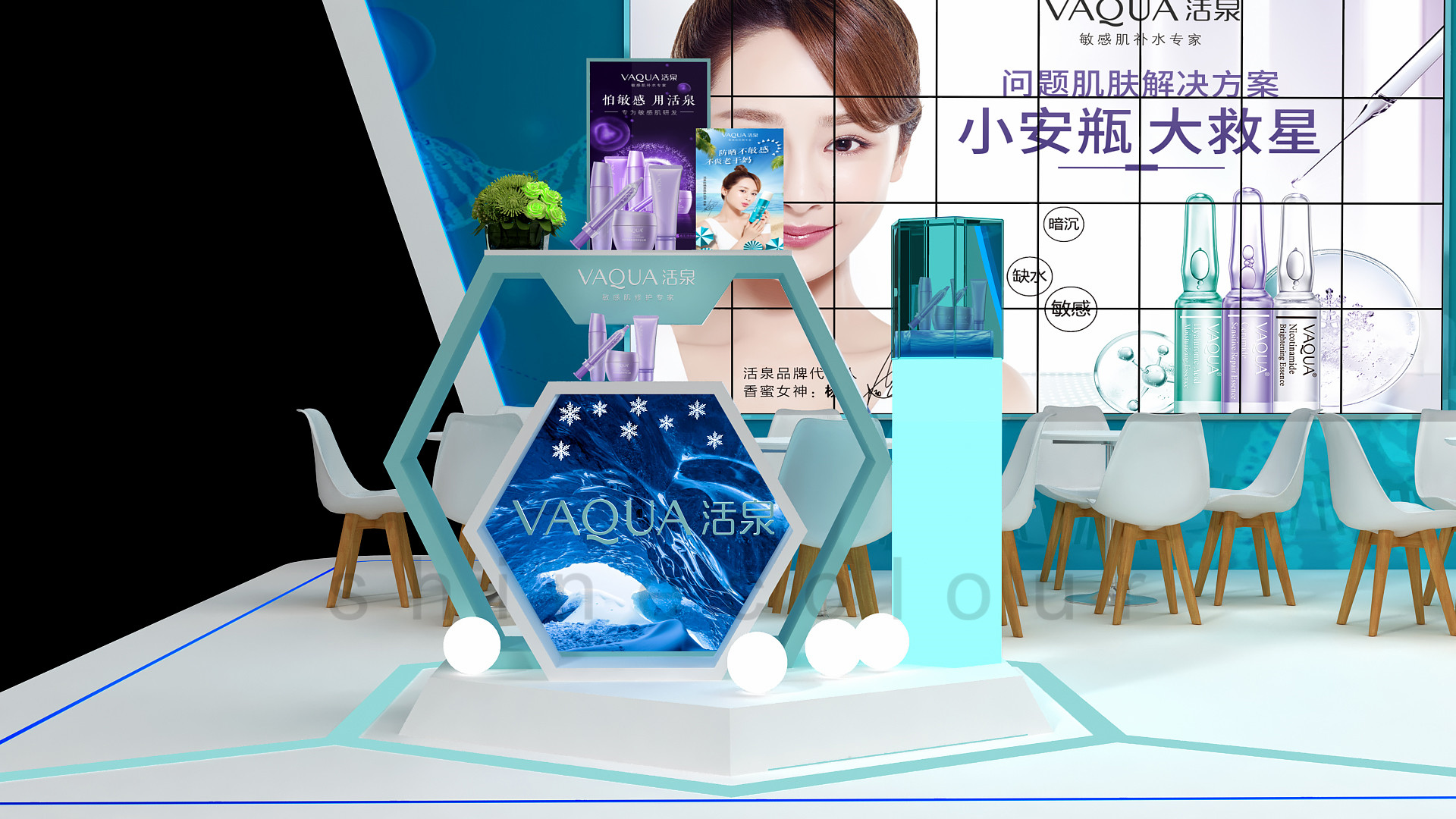 (1)活泉化妆品这次的展台的设计,突出了主体背墙的大造型,以其为视觉中心点。轻装修,重装饰的理念,让这次展台的效果有了更加经得起推敲的细节结构与装饰,六边形为设计主元素,贯穿展台,让现场效果更具有轻医美的特色,功能与造型相辅相成,融为一体。