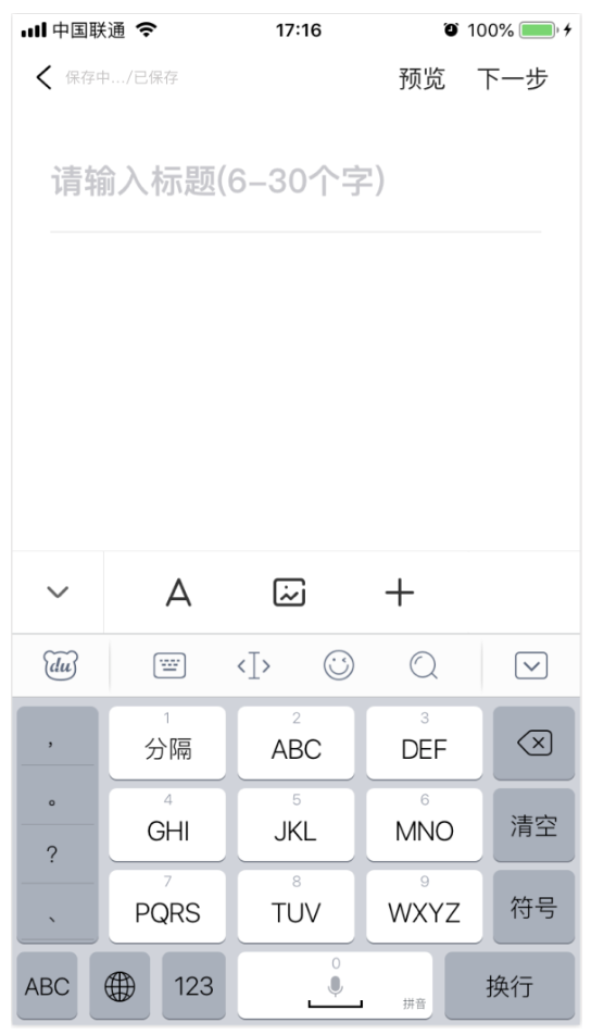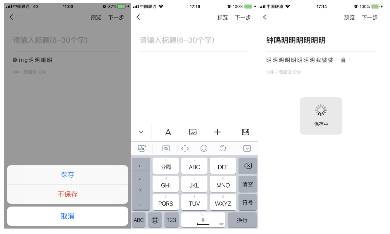 如下图,为优化后的方案,将“保存中”、“已保存”的状态提示放在顶部导航栏的左侧,位于返回按钮右侧,用户有输入行为时,就显示“保存中”状态,打消用户不知怎么保存的顾虑。当用点击返回时,在进行一次保存。自动保存的规则可以是每N分钟自动保存一次,如果存在自动保存至服务器加载时间太久的问题,那么可以先自动保存至本地,等用户点击返回时,再将本地的数据同步至服务器,这需要研发工程师将保存的复杂逻辑隐藏在系统里。也许这会增加研发难度,但是这是好的用户体验应当付出的成本。对于用户来说,不管是保存至本地、还是同步至服务器,这都是系统的事,用户唯一需要知道的就是,文章保存了,且不会丢,这就够了。