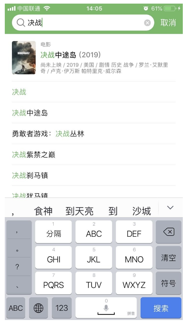 1.如图示,豆瓣APP在用户使用搜索功能时,对输入的关键字进行实时的模糊匹配,提前为用户展示匹配的结果。这样设计的优点是,用户无需输入完整,也无需点击搜索按钮,就能预先知道是否有匹配的结果,提升了用户的搜索效率和搜索体验。对研发工程师来说,实现起来,会投入更多精力,比如模糊匹配增加了访问服务器的频率,或许还需要对接口和字段进行升级,对模糊匹配准确性做策略等等。但是在用户体验上,是非常明显的体验提升,因此在时间、资源、数据库允许的情况下,请尽量为搜索交互模式提供模糊匹配的功能(感觉会被研发小哥亲切的问候,但是,用户至上啊)。