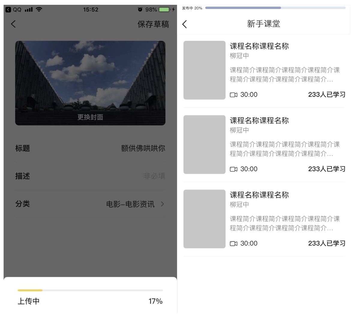 一、在体验一款为自媒体人开发的APP时,我遇到过这样的设计方案,当我选择了一个要发布的视频,且设置了标题、分类等信息后,点击发布按钮,页面底部弹出一个发布进度提示条,页面背景有蒙层,如左图所示。在此状态下,我无法在APP内进行任何其他操作,只能等待视频上传完成。这样的设计方案,严重损害了用户体验。